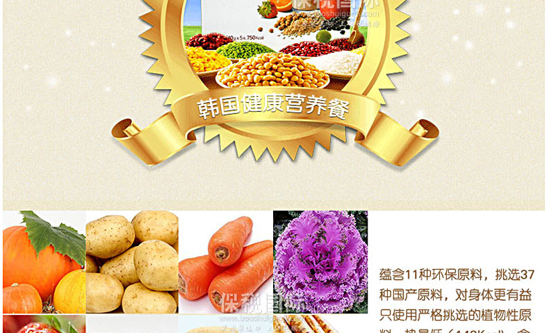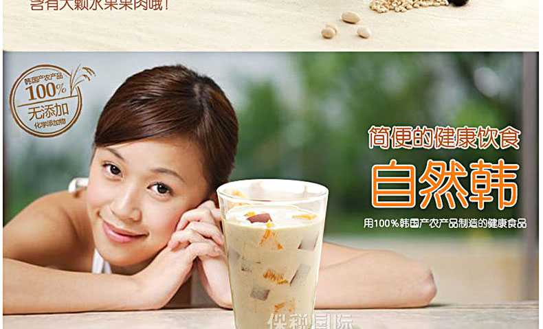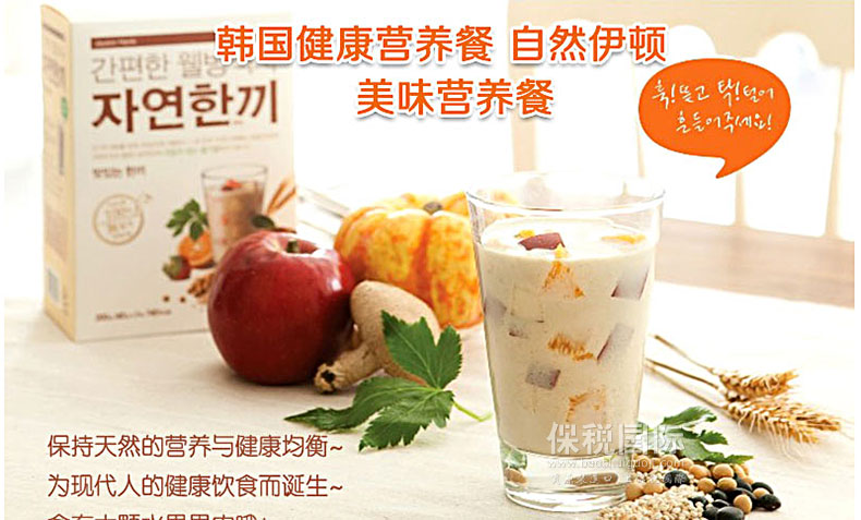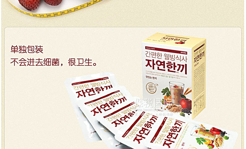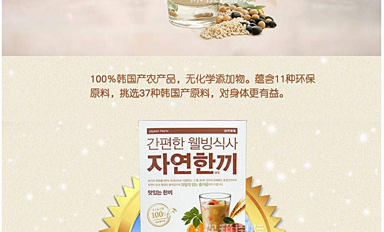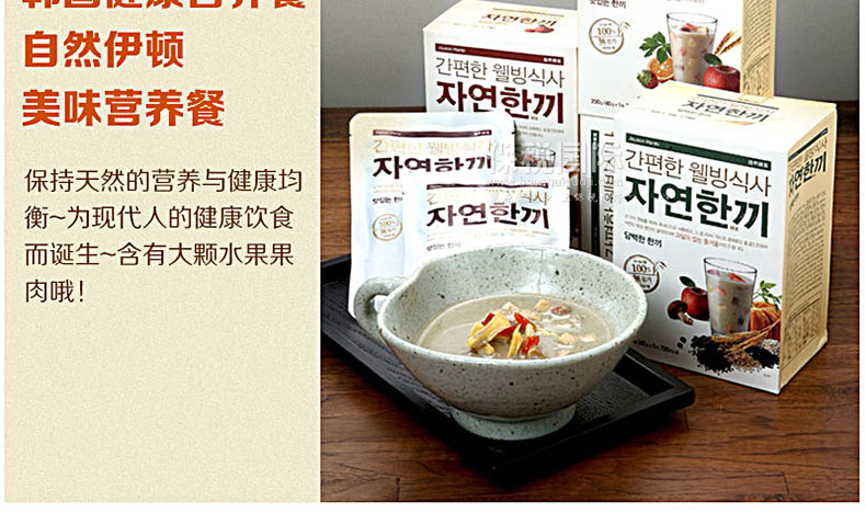 1. 100%韓國產農產品,無化學添加物。蘊含11種環保原料,挑選37種韓國產原料,對身體更有益。 2. 只使用嚴格挑選的植物性原料,熱量低(148Kcal),含有植物纖維,有助于減肥。 3. 可以用做代餐,也可用做野外活動和出差時需要的攜帶食品,是輕便簡單的營養零食。 |