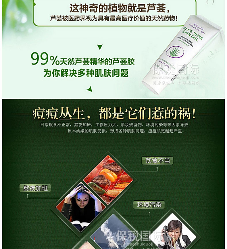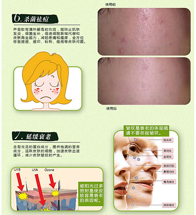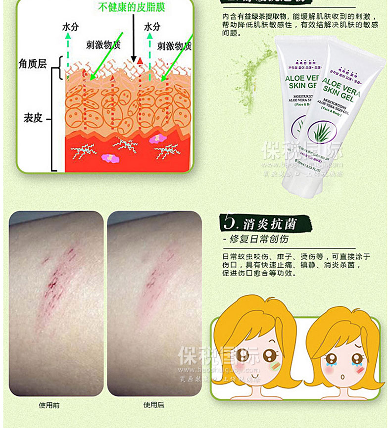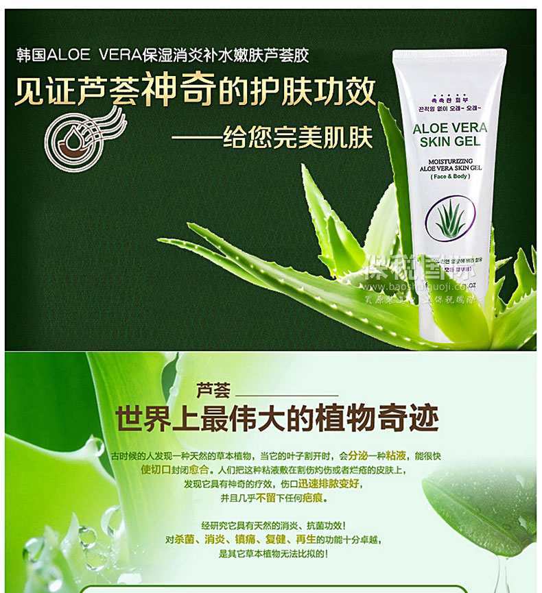 韓國(guó)ALOE VERA保濕消炎補(bǔ)水嫩膚蘆薈膠 100ml—— 蘆薈膠滲入肌膚,濕潤(rùn)的使用感受,卓越的清涼感,可以使毛孔收縮,維持潤(rùn)澤有彈性的潔凈肌膚,是一款可以去除油膩,打造爽快肌膚觸感的凝膠式高級(jí)護(hù)膚精華液。補(bǔ)充水分、快速吸收、調(diào)節(jié)油脂、鎮(zhèn)靜保濕。持久滋潤(rùn)皮膚,無(wú)黏著感~~有冷卻效果,接觸皮膚瞬間去熱,使皮膚變涼爽同時(shí)迅速吸收。 |