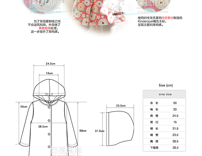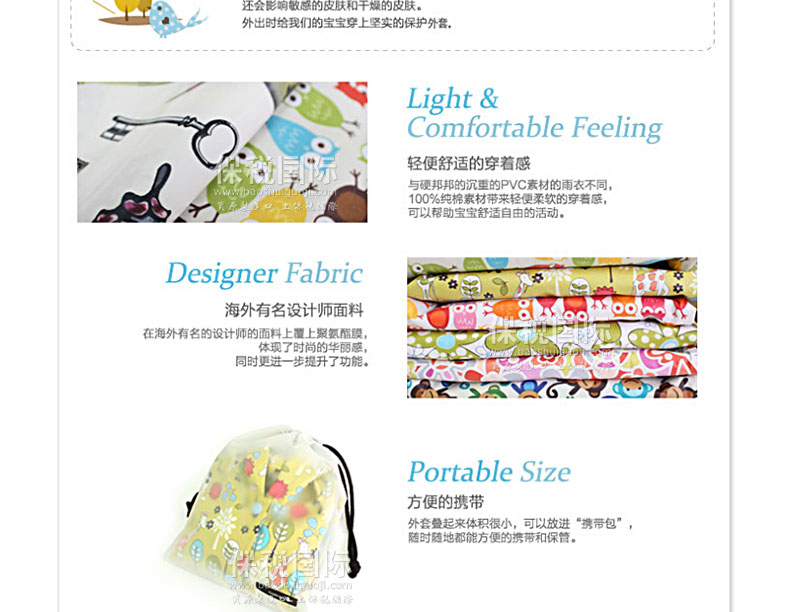 風雨中保護寶寶的時尚風衣 有風的日子用作擋風衣,下雨的日子用作雨衣,黃沙大的日子用作安心的保護膜,天氣好的日子用作時尚外套。 1. 韓國嬰幼兒用品界第一企業(yè)(株)petitelin的品牌。 2. 刮風的日子、下雨的日子、黃沙大的日子保護寶寶。 3. 與硬邦邦的沉重的PVC素材的雨衣不同,100%純棉素材帶來輕便柔軟的穿著感,可以幫助寶寶舒適自由的活動。 4. 在海外有名的設計師的面料上覆上聚氨酯膜,體現了時尚的華麗感,同時更進一步提升了功能。 5. 外套疊起來體積很小,可以放進“攜帶包”,隨時隨地都能方便的攜帶和保管。 |