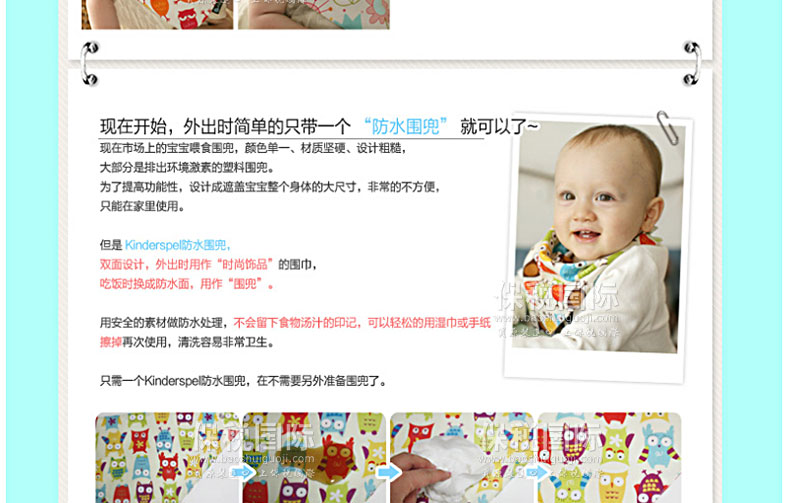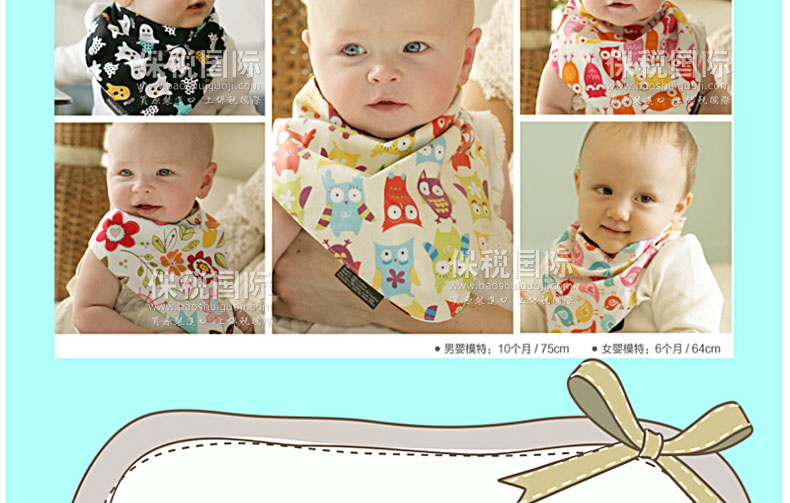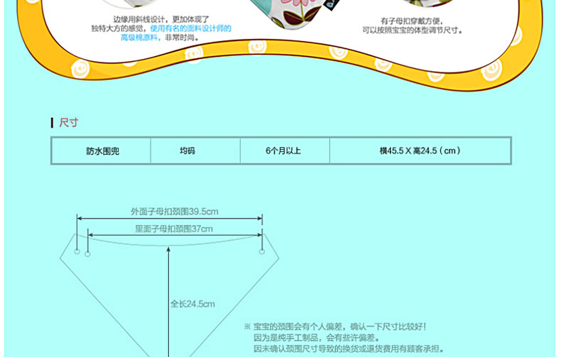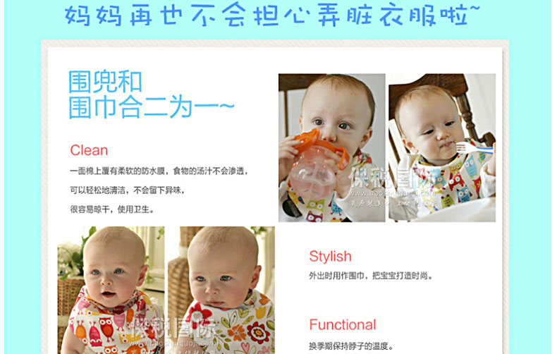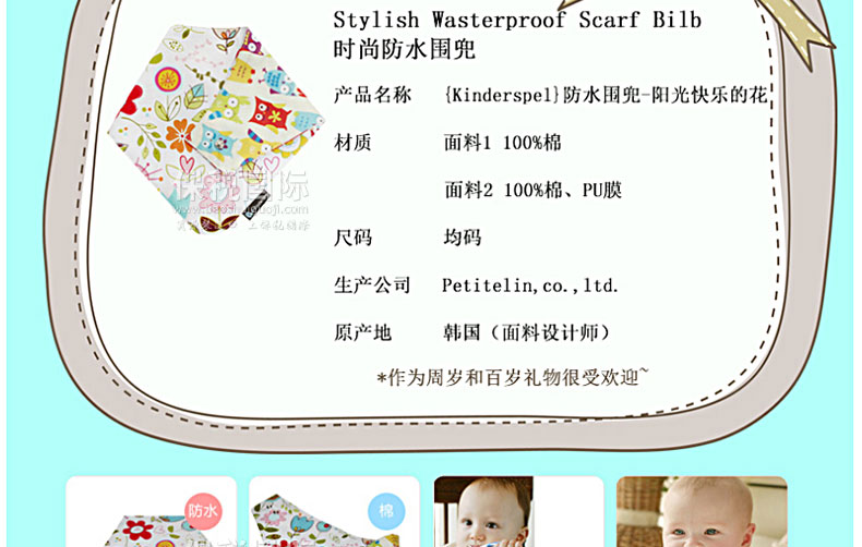 時尚防水圍兜雙面設計,外出時用作“時尚飾品”的圍巾,吃飯時換成防水面,用作“圍兜”。用安全的素材做防水處理,不會留下食物湯汁的印記,可以輕松的用濕巾或手紙擦掉再次使用,清洗容易非常衛生。 1. 韓國嬰幼兒用品第一企業(株)petitelin的品牌。 2. 一面棉上覆有柔軟的防水膜使用衛生。 3. 外出時用作圍巾,把寶寶打造時尚。 4. 換季期保持脖子的溫度。 |
