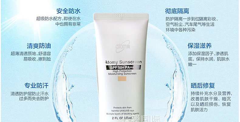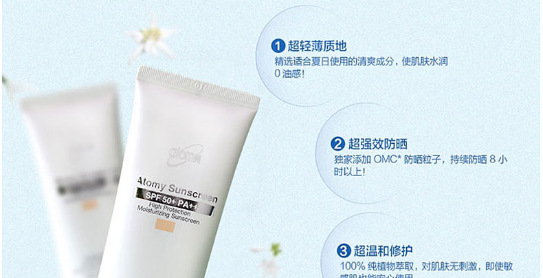 | ?品 牌 | ?? 韓國Atomy | 功 效 | 全效防曬!雙重抵擋有害皮膚的紫外線UV-A與UV-B,保護皮膚,打造健康肌膚 | |