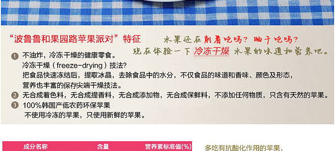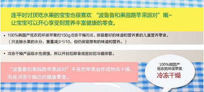 1. 不油炸,冷凍干燥的健康零食。 2. 無合成著色料,無合成提香料,無合成添加物,無合成保鮮料,不添加任何物質,只含有天然的草莓。 3. 100%韓國產低農藥環保蘋果。 4. 直接使用新鮮的蘋果。 |
