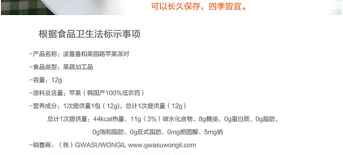 韓國健康營養水果干 波魯魯和果園路蘋果派對 12g×6袋 |