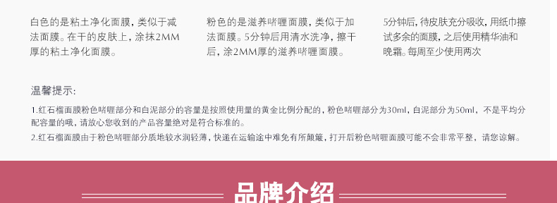 全新鮮亮煥采精華面膜,感官體驗,足不出戶,享受居家迷你面部spa。一盒兩用, 每次用的時候, 先用排濁凈化白泥面膜,有效清透肌膚;再用粉色滋潤者哩面膜,融入紅石榴萃取物,為肌膚帶來深層滋潤和滋養效果。 白泥面膜5-10分鐘為宜,粉泥面膜可以當睡眠面膜使用無需沖洗。