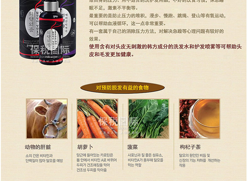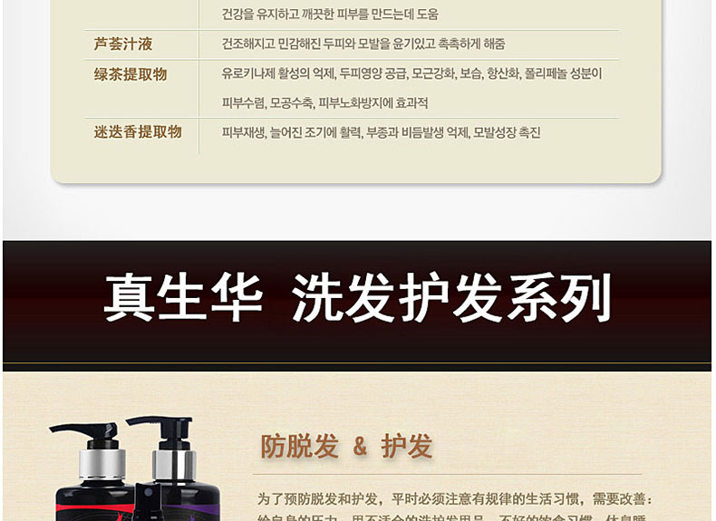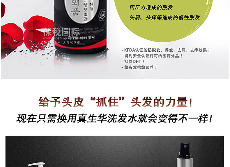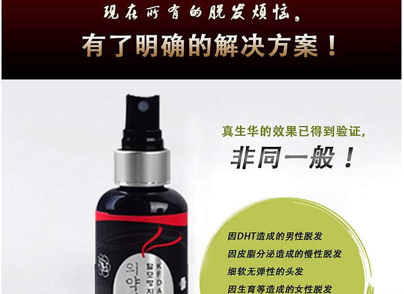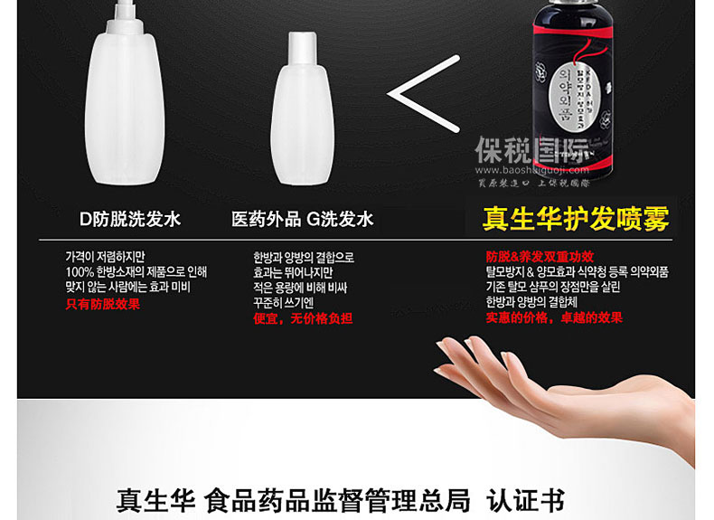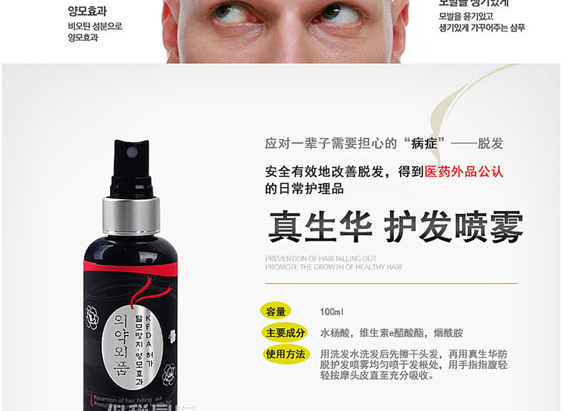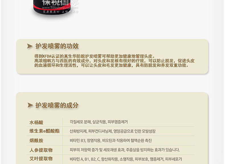 韓國真生華 防脫護發噴霧 100ml—— 使用方法:用洗發水洗發后先擦干頭發,再用真生華防脫護發噴霧均勻噴于發根處,用手指指腹輕輕按摩頭皮直至充分吸收。 |