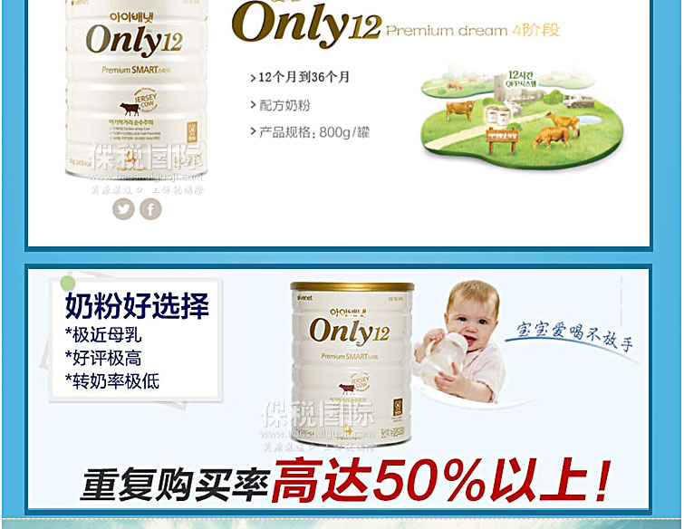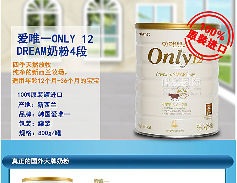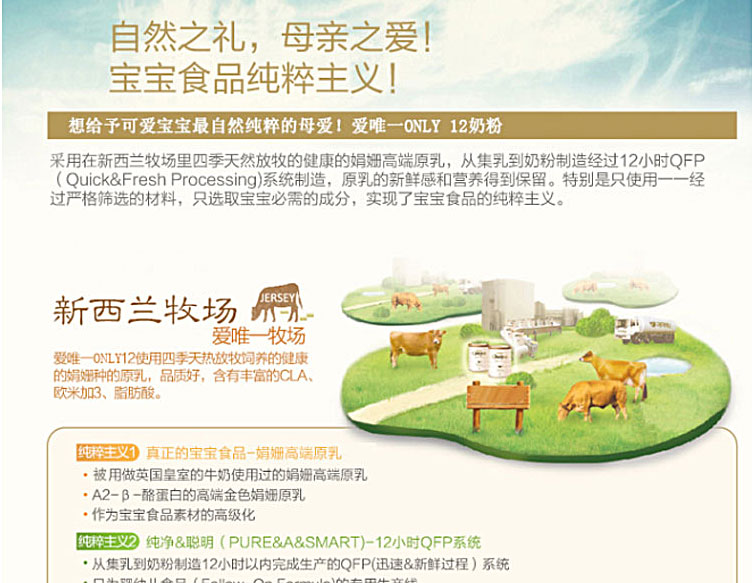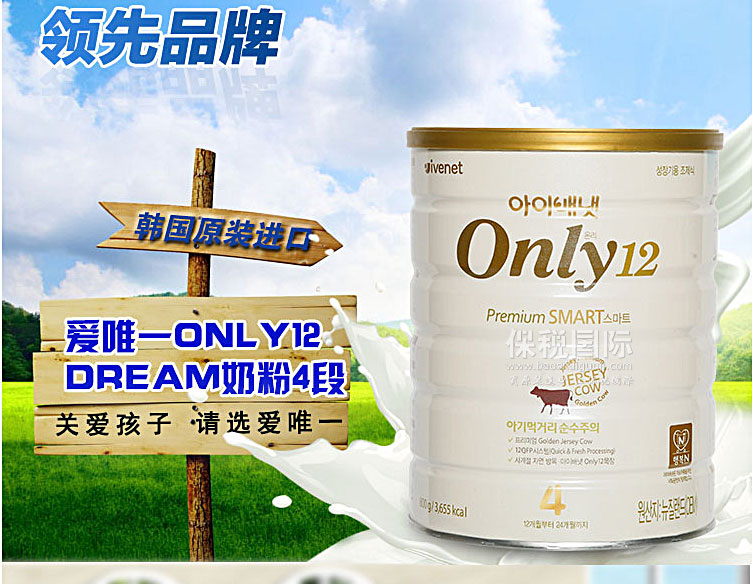 韓國原裝進口 愛唯一ONLY 12 DREAM奶粉 4段 800g—— 1. 純粹主義1-真正營養給寶寶吃的娟姍高端原乳。 2. 純粹主義2-純凈&聰明(PURE&SMART)-12小時QFP系統。 3. 純粹主義3-關愛寶寶的均衡營養-根據CODEX嬰幼兒配方食品規格進行營養設計。 4. 純粹主義4-徹底的品質管理-寶寶吃的安心。 5. 純粹主義5-四季天然放牧-純凈的新西蘭牧場。 |