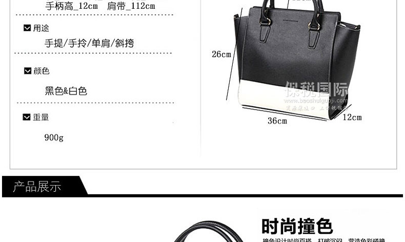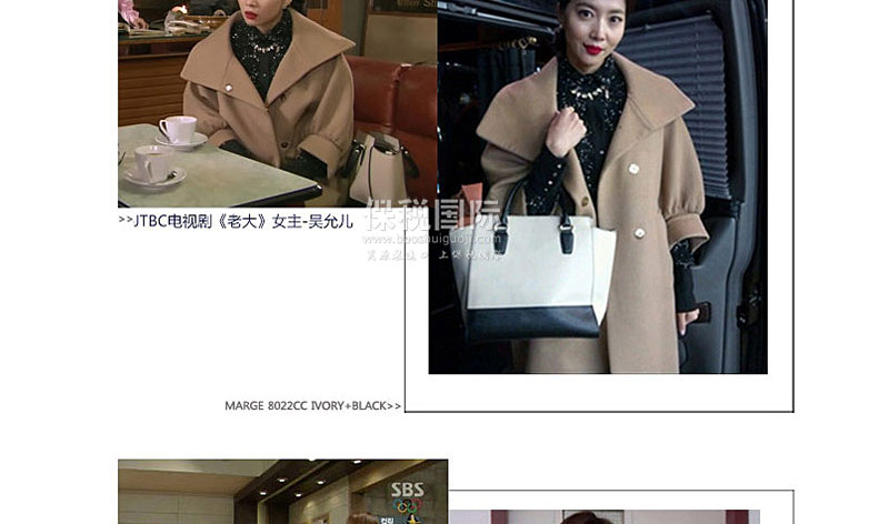 韓國明星愛用品牌MARGE SHERWOOD - MARGE SQUARE 8022 黑色&白色 雙色拼接手提包—— 尺寸:長_36cm 高_26cm 寬_12cm 手柄高_12cm 肩帶_112cm 集簡單、時尚、古典風格于一身的8022款包包,顏色多樣且搭配突出, 受20~30歲女性的熱愛,適合每日攜帶。 |