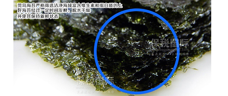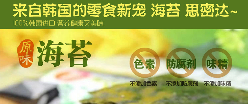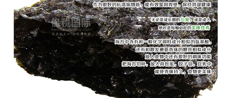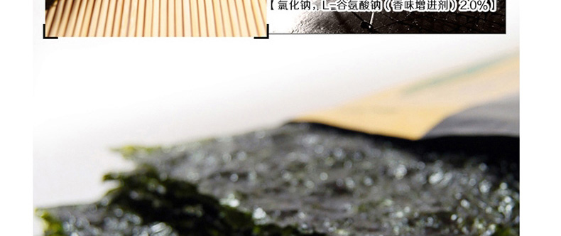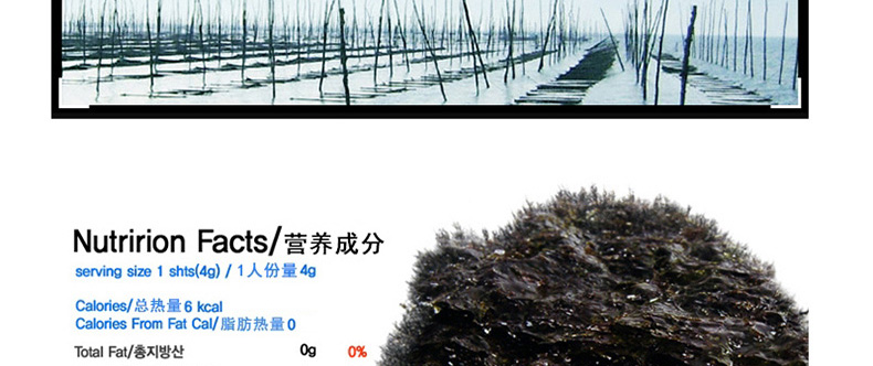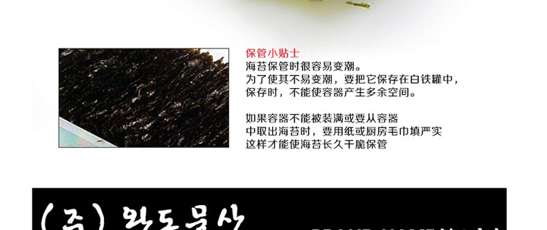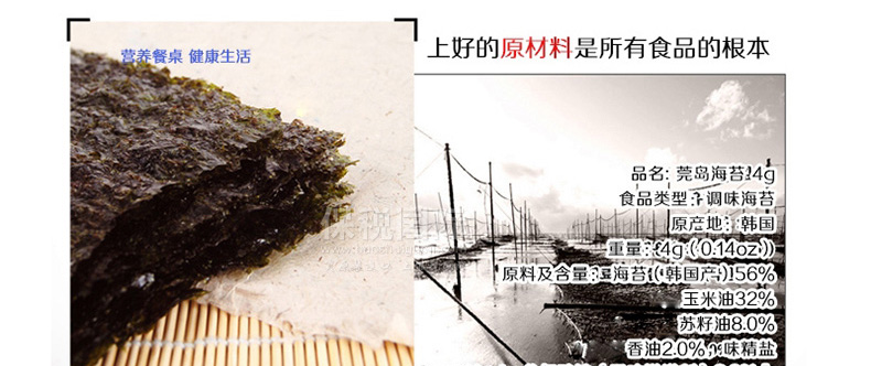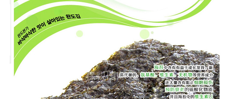 | 產品說明 | 韓國自然美味 開心零食片刻共享 莞島即食調味海苔—— 1. 莞島海苔嚴格篩選潔凈海域富含維生素和蛋白質的上好海苔精制而成。 2. 海苔中富含氨基酸,維生素,無機物等營養成分,有益于成長發育,新陳代謝。 3. 海苔中含有氨基酸等成分,是天然上好調味品。 4. 為了使其不易變潮,要把它保存在白鐵罐中,保存時,不能使容器產生多余空間。 | |||