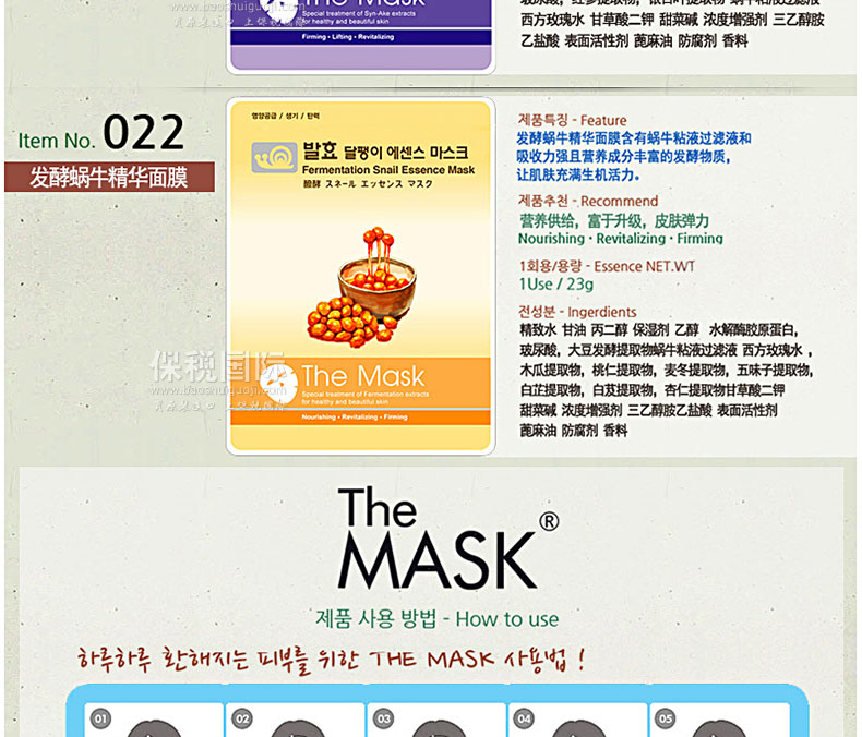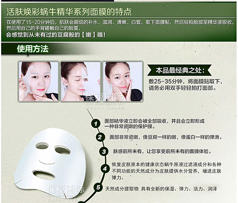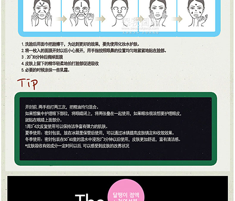 韓國Arang活膚煥彩玻尿酸凈化保濕面膜10片裝—— 隨著那一抹輕盈的沁入,每個細胞都喝飽水,輕薄透氣的質地,在滋 養肌膚的同時,還可以讓肌膚深呼吸。于輕柔按摩間,溫軟潤澤悄然釋放。如此清新、粉潤的臉龐,不 禁時時輕撫,喜悅直達心靈深處。 使用方法:潔面后先使用爽膚水整頓肌膚,然后取出面膜貼貼 于面部,過15-20分鐘后將面膜貼揭下,用手輕拍殘留在臉上的精華液,使精華液全部吸收。 |