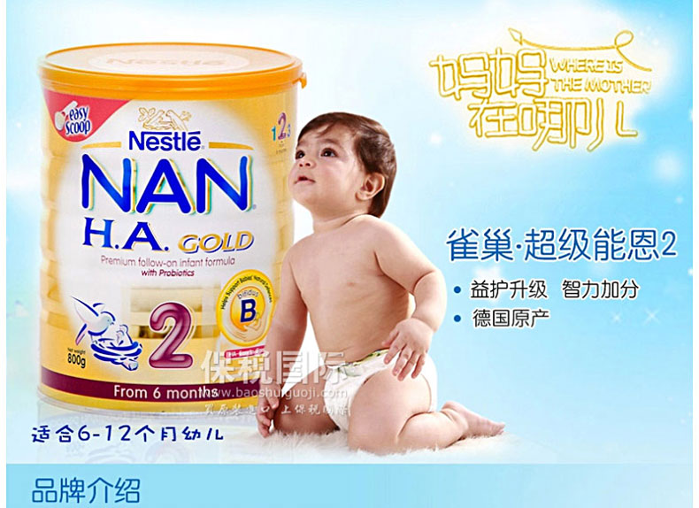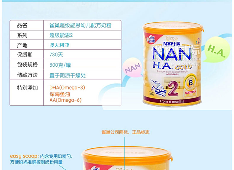 澳大利亞原裝進口 Nestle雀巢嬰兒奶粉 NAN HA 超級能恩2段 800g/罐 |