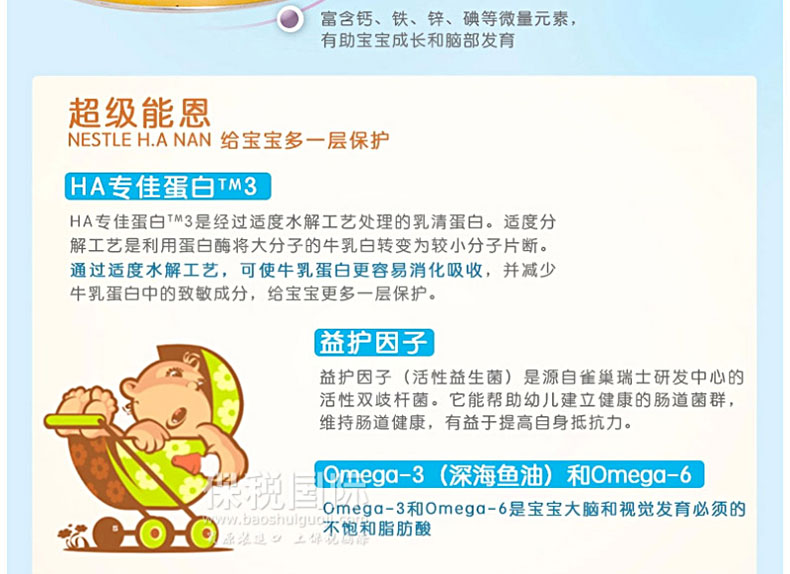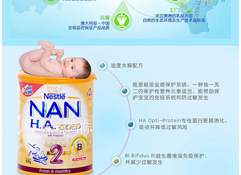 澳大利亞原裝進口 Nestle雀巢嬰兒奶粉 NAN HA 超級能恩2段 800g/罐—— 1. 這是款添加有雙歧桿菌,特別為6個月以上的健康寶寶配制的營養全面、優質100%乳清嬰幼兒配方奶粉。 2. 部分水解的乳清蛋白制成,會更容易被寶寶消化,不易引起過敏。 3. 并加入益護因子:即雙歧桿菌,是源自雀巢瑞士研發中心的獨特的活性益生菌。 4. 每餐奶中多達3600萬益護因子,可以幫助寶寶的自然腸道菌群,免疫系統和消化系統。 5. 它還含有魚油,以幫助支持最佳的大腦和視覺發育。 |