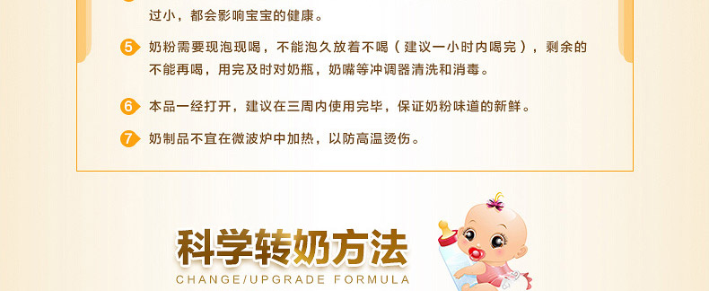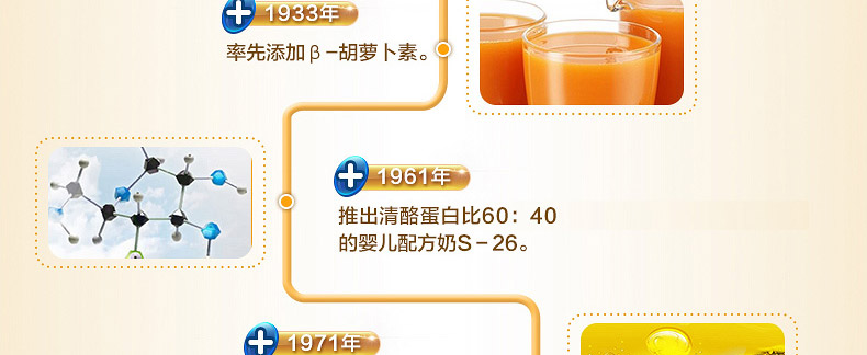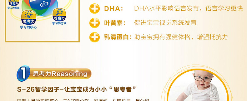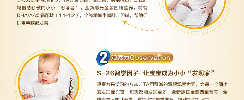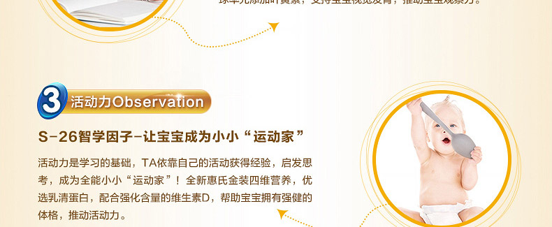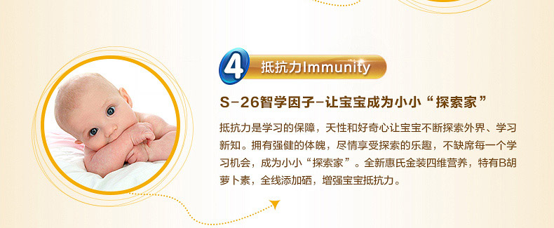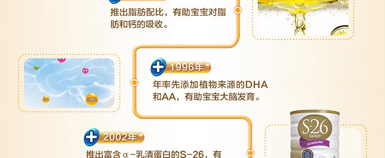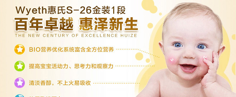 新西蘭原裝進口 S26惠氏金裝嬰兒奶粉1段 0-6個月 900g/罐—— 1. a乳清蛋白:蛋白質是生命的基礎,是所有營養中的第一要素。 2. 嬰幼兒的吸收劑代謝功能尚未發育成熟,過量且不當地補充蛋白質只會給寶寶帶來更多負擔。 3. 惠氏金裝系列特別優選適量a乳清蛋白,不僅在消化過程中能形成細軟的絮狀凝乳,更易吸收利用,還能降低身體的代謝負擔。 4. 配方更科學,給寶寶提供更好的蛋白平衡,S26奶粉使用乳清蛋白。 |