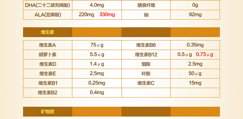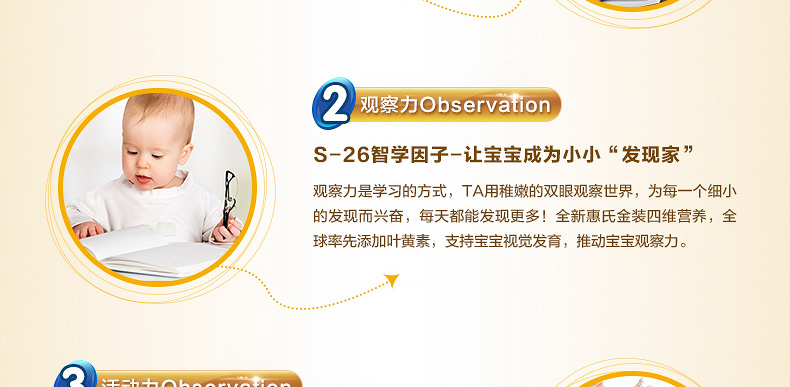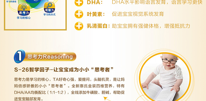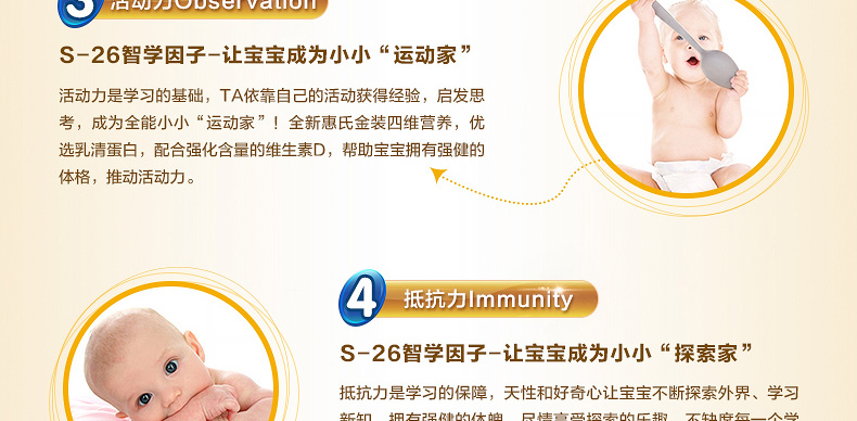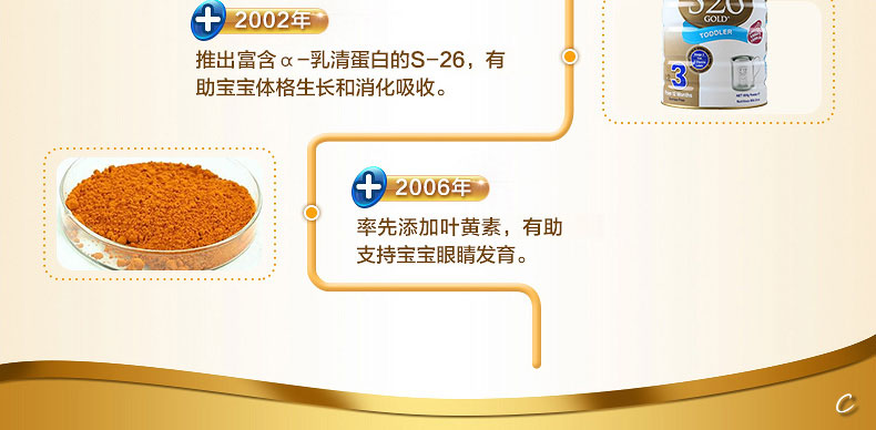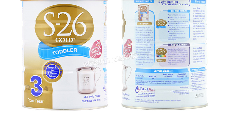 新西蘭原裝進口 S26惠氏金裝嬰兒奶粉3段 1歲以上寶寶 2罐裝—— 1. 富含a乳清蛋白,均衡比例的DHA和AA并添加葉黃素。 2. 含有24種幼兒所必需的維生素和礦物質及天然胡蘿卜素。 3. 均衡比例的DHA/AA,可以促進大腦的發育,改善大腦的代謝、促進神經系統的信息傳遞,增強視力、改善鈣的代謝,從而有效的促進大腦的發育。 4. 攝入葉黃素量高,有助于延緩眼睛的老化、退化、病變,減少眼疾的發生率,還可以保護視網膜免受光線的傷害。 |