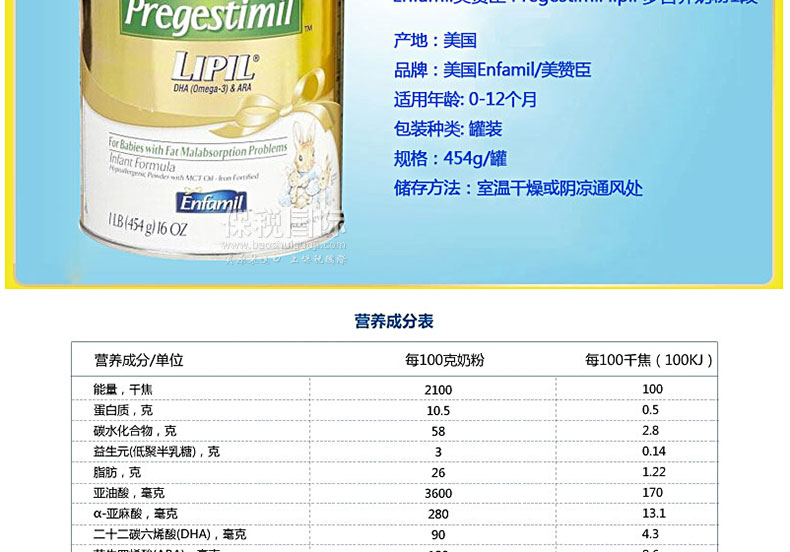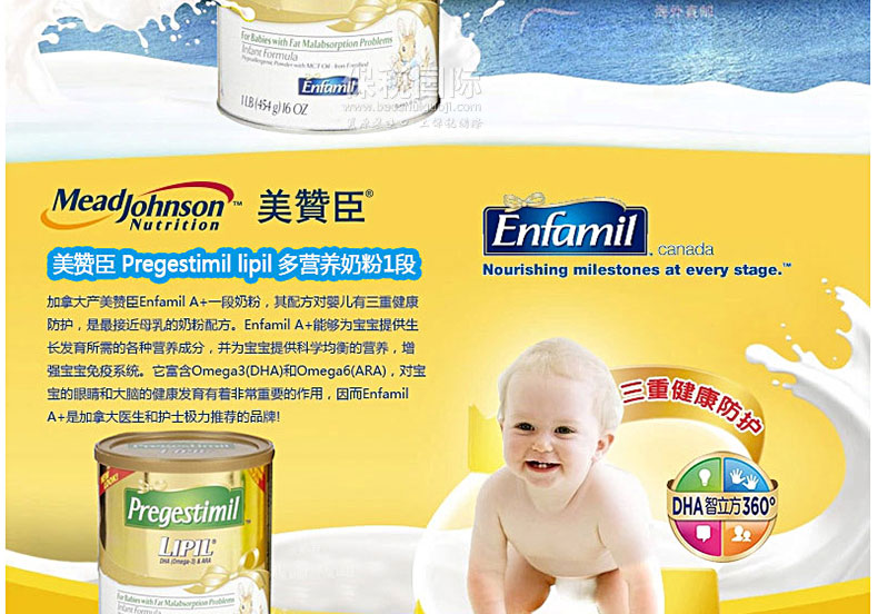 美國原裝進口 Enfamil美贊臣 Pregestimil lipil 多營養奶粉1段 454g/罐—— 1. 含有DHA/ARA,其中MCT中鏈脂肪酸占總脂肪含量的57.7%。 2. 營養完整均衡的水解蛋白配方,含有中鏈三酸甘油脂(MCT Oil),適用于有長鏈脂肪酸代謝障礙的嬰兒。 3. 牛奶蛋白過敏或乳糖不耐受的嬰兒也可食用,更適用于雙糖不耐癥的嬰兒。 |