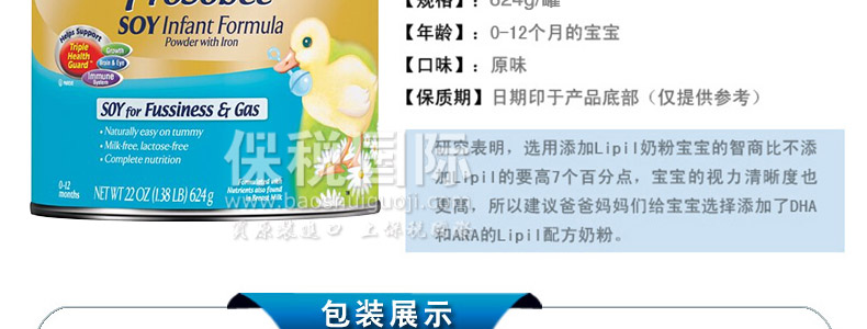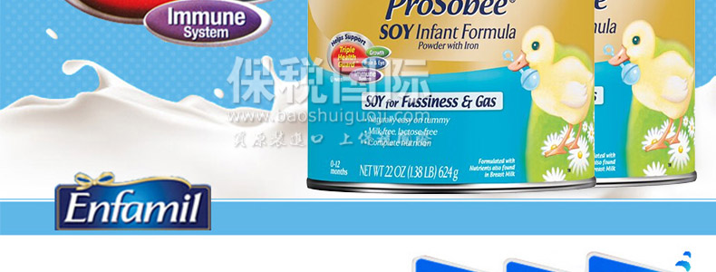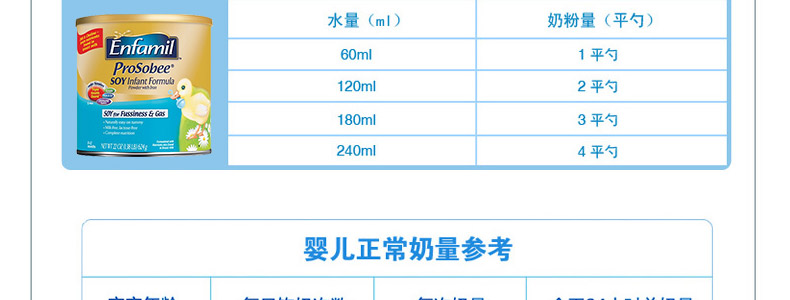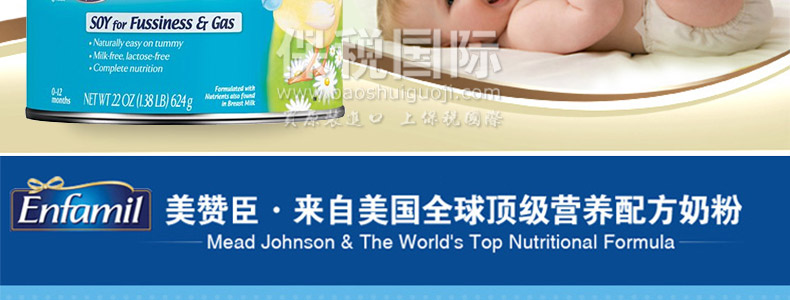 美國(guó)原裝進(jìn)口 Enfamil美贊臣 防脹防過敏 嬰幼兒大豆奶粉 1段 624g/罐*2—— 1. 用植物性蛋白、脂肪、碳水化合物制成的,大豆為基質(zhì),不含牛奶,不含乳糖,不含蔗糖,含有豐富的DHA。 2. 采用鐵強(qiáng)化豆奶粉配方,不含乳糖、蔗糖、牛奶蛋白,適用于對(duì)動(dòng)物蛋白、奶基過敏、吐奶、有腹瀉、啼哭不止和脹氣的寶寶。 3. 該款豆奶粉營(yíng)養(yǎng)組合科學(xué)全面,包含醫(yī)生推薦頭12個(gè)月的寶寶必須的所有營(yíng)養(yǎng)元素。 4. 豆奶粉碳水化合物甜度更與母乳中乳糖甜度相當(dāng)。 |