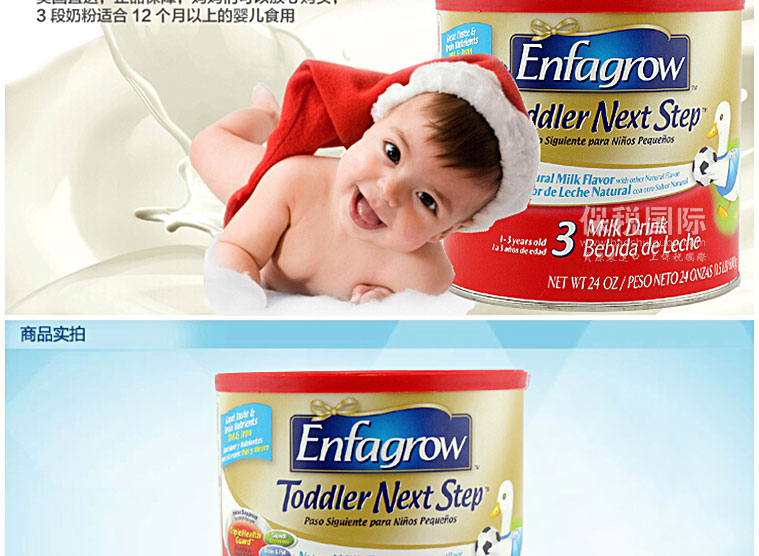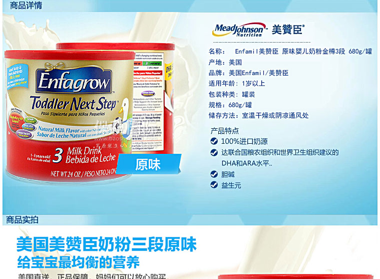 美國(guó)原裝進(jìn)口正品 Enfamil美贊臣 原味嬰兒奶粉金樽3段 680g/罐—— 1. 美贊臣特為24個(gè)月以上的寶寶量身定做的Lipil配方奶粉,營(yíng)養(yǎng)豐富。 2. 在牛奶的基礎(chǔ)上增加鈣、維生素C、D、E及25種以上嬰兒健康成長(zhǎng)和發(fā)育所需的營(yíng)養(yǎng),補(bǔ)充寶寶成長(zhǎng)所需。 3. 添加幫助寶寶腦力發(fā)育的重要因素:DHA和鐵,促進(jìn)大腦和眼睛發(fā)育。 4. 讓寶寶健康成長(zhǎng)營(yíng)養(yǎng)不缺失,增強(qiáng)免疫力。 |