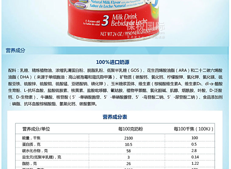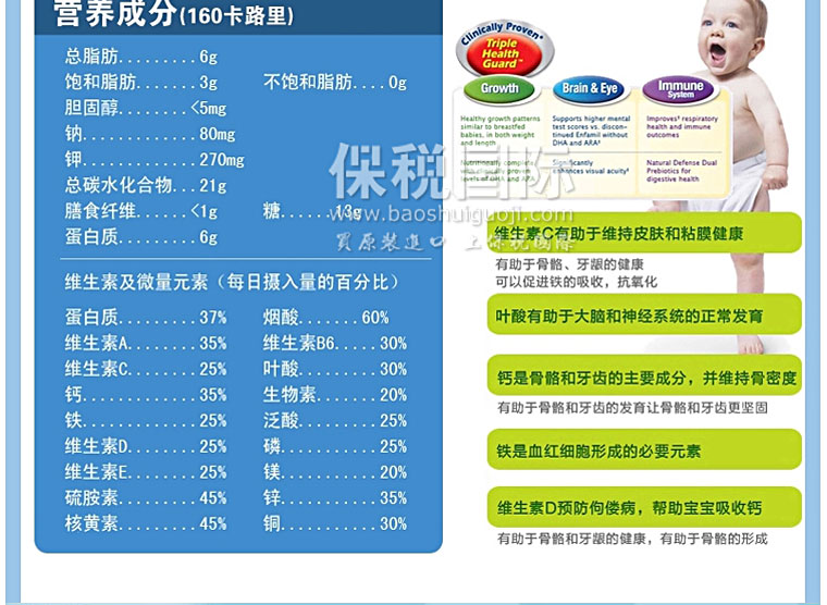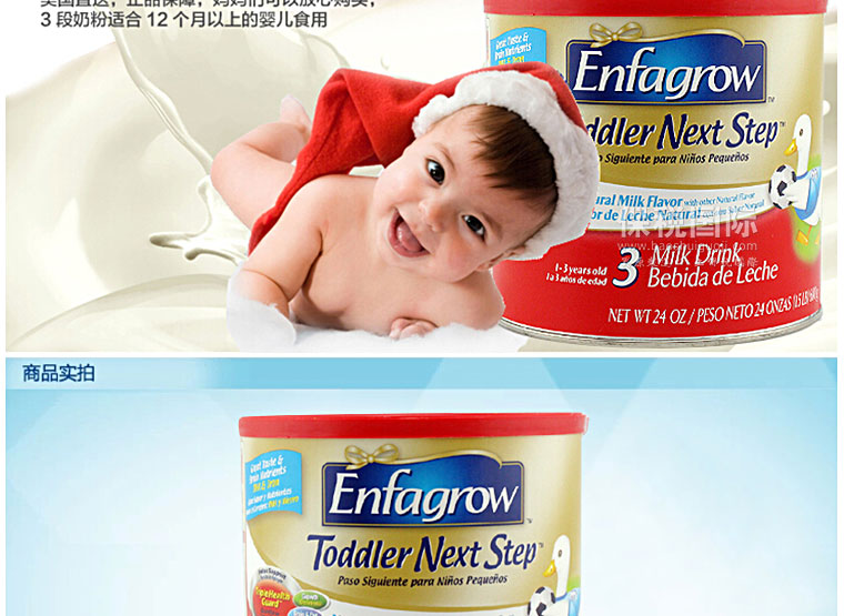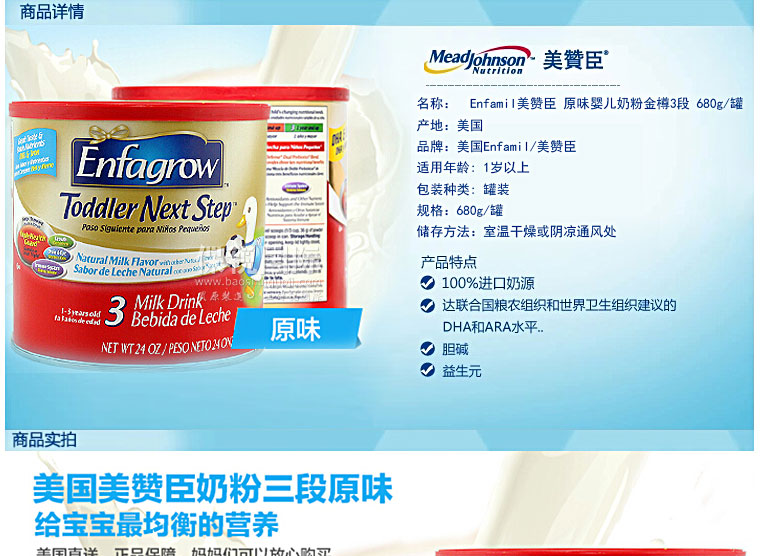 美國原裝進口正品 Enfamil美贊臣 原味嬰兒奶粉金樽3段 680g/罐*3—— 1. 美贊臣特為24個月以上的寶寶量身定做的Lipil配方奶粉,營養豐富。 2. 在牛奶的基礎上增加鈣、維生素C、D、E及25種以上嬰兒健康成長和發育所需的營養,補充寶寶成長所需。 3. 添加幫助寶寶腦力發育的重要因素:DHA和鐵,促進大腦和眼睛發育。 4. 讓寶寶健康成長營養不缺失,增強免疫力。 |