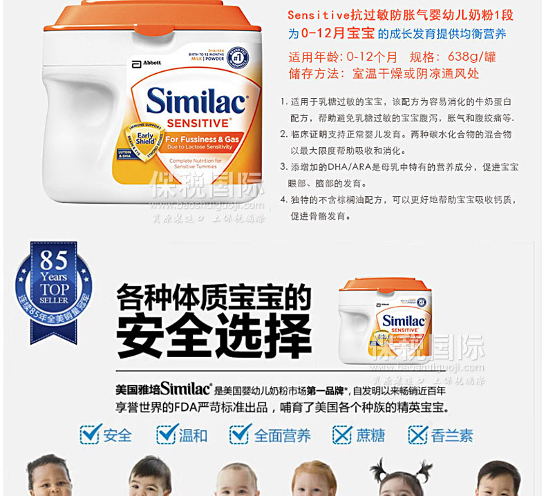 美國原裝進口 Similac雅培 sensitive防脹氣 嬰幼兒1段奶粉 638g/罐—— 1. Similac雅培Sensitive嬰幼兒防脹氣抗過敏一段奶粉,適用于乳糖過敏的寶寶。 2. 該配方為容易消化的牛奶蛋白配方,幫助避免乳糖過敏引起的寶寶腹瀉,脹氣和腹絞痛等癥狀。 3. 臨床證明支持兒童正常發育。 4. 兩種碳水化合物(玉米麥芽糊精和蔗糖)的混合物以最大限度的幫助吸收和降低消化的風險。 5. 添加的DHA/ARA是母乳含有的營養成分,促進嬰幼兒的眼睛、大腦發育。 6. 獨特的不含棕櫚油配方更好的幫助鈣質吸收,促進骨骼發育。 |