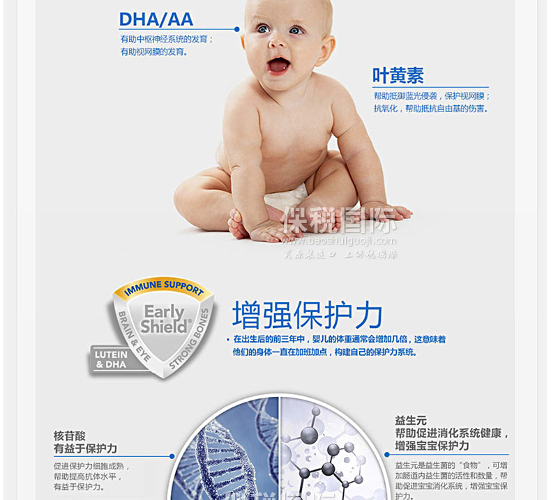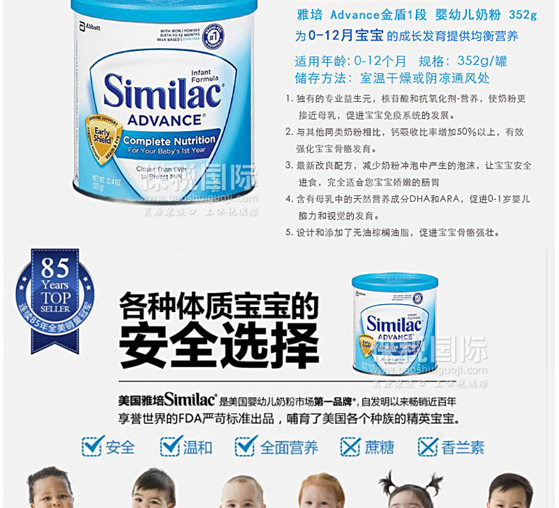 美國原裝進(jìn)口 Similac雅培 Advance金盾1段 嬰幼兒奶粉 352g/罐 —— 1. 獨(dú)有的專業(yè)益生元,核苷酸和抗氧化劑-營養(yǎng),使奶粉更接近母乳,促進(jìn)寶寶免疫系統(tǒng)的發(fā)展。 2. 與其他同類奶粉相比,鈣吸收比率增加50%以上,有效強(qiáng)化寶寶骨骼發(fā)育。 3. 最新改良配方,減少奶粉沖泡中產(chǎn)生的泡沫,讓寶寶安全進(jìn)食,完全適合您寶寶嬌嫩的腸胃 4. 含有母乳中的天然營養(yǎng)成分DHA和ARA,促進(jìn)0-1歲嬰兒腦力和視覺的發(fā)育。 5. 設(shè)計和添加了無油棕櫚油脂,促進(jìn)寶寶骨骼強(qiáng)壯。 |