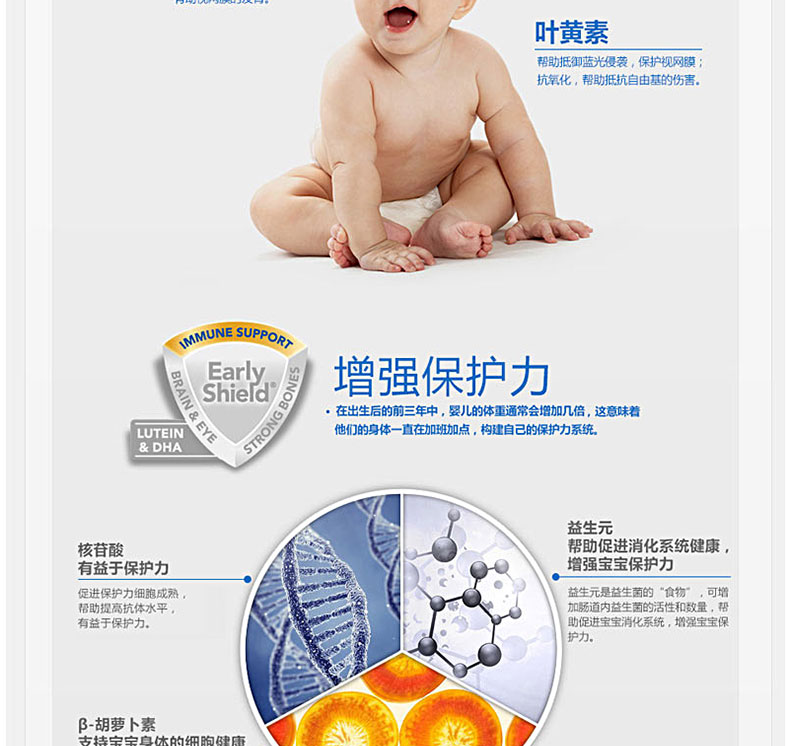 美國原裝進口 Similac雅培 Total Comfort 抗過敏全護配方奶粉 638g/罐*2—— 1. 雅培全護配方奶粉使蛋白質充分溶解讓寶寶更容易吸收。 2. 葉黃素和DHA的獨特的配方,有利于眼睛和大腦的發育。 3. 使混合碳水化合物更容易消化,對寶寶的胃更溫柔的呵護。 4. 使寶寶的免疫系統,大腦,眼睛,和筋骨更加強勁。 5. 添加導致寶寶虛胖的蔗糖和增加腎臟負擔的香精。 |