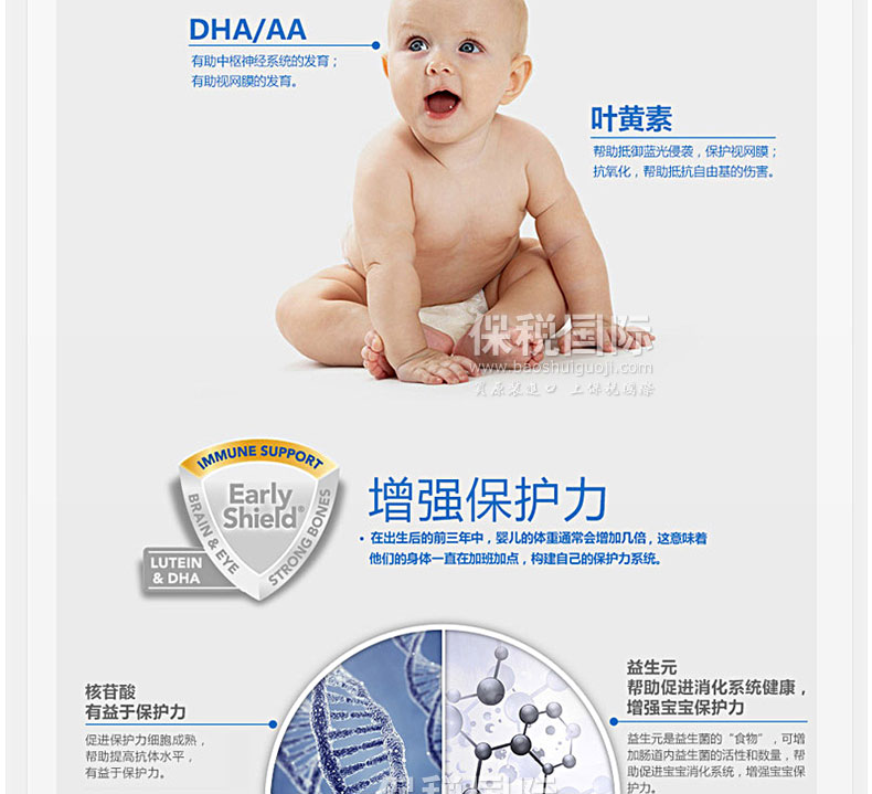 美國原裝進口 Similac雅培 Similac含鐵大豆奶粉 防腹瀉脹氣1段 657g/罐*2—— 1. 雅培Similac lsomil嬰兒大豆奶粉特別針對對牛奶過敏的寶寶設計的配方奶粉。 2. 適用于對乳糖過敏而腹瀉和一般腹瀉的寶寶。 3. 核苷酸.益生菌和類胡蘿卜素促進嬰兒自身免疫系統的發育和形成。 4. DHA和ARA還有其它Omega脂肪酸促進嬰兒大腦及視覺系統的發育完善。 5. 無棕櫚油脂成分,提高53%的鈣的吸收和沉淀,生成強壯的骨骼系統。 注意:該款大豆配方嬰兒奶粉不推薦給早產兒和出生時體重低于1800克的低體重兒。 |