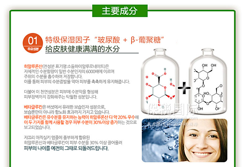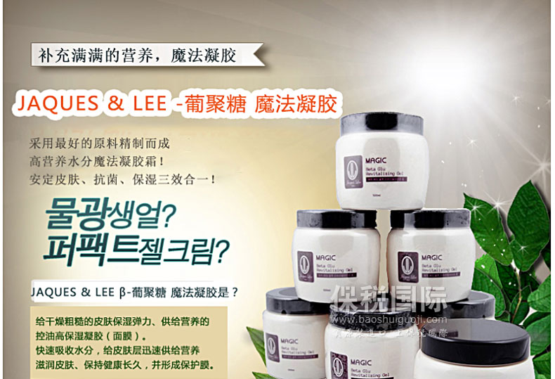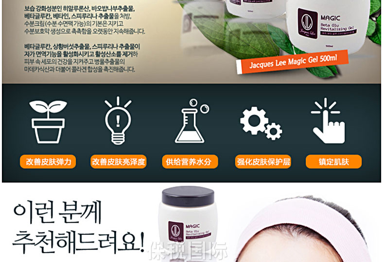 韓國功能性化妝品 JAQUES&LEE β-葡聚糖 魔法活膚凝膠 500ml —— 1. 給干燥粗糙的皮膚保濕彈力、供給營養的控油高保濕凝膠(面膜)。 2. 保濕強化成分:天然精華露、菊花樹提取物、天然活性精華迷迭香、白樺樹登提取物等形成對皮膚水分的保護膜,長久保濕。 3. 天然活性礦泉水、野山上的蘑菇、夏威夷的堅果提取物,形成一種自身的棉衣功能,強化皮膚內的細胞。 4. 大豆發酵物等富含膠原蛋白成分的合成物,促進細胞再生,恢復皮膚彈性,改善肌膚。 5. 夏威夷堅果提取物和大豆發酵提取成分, 促進皮膚的血液循環,去除皮膚角質,去死皮。 6. 富含植物提取成分的坦尼成分,舒緩肌膚,促進肌膚的新生代謝,深入皮膚內部供給營養補充水分,天然活性水分因子收縮毛孔。 7. 各種活性因子和營養成分可以促進受損傷的皮膚再生,鎮定肌膚。 |