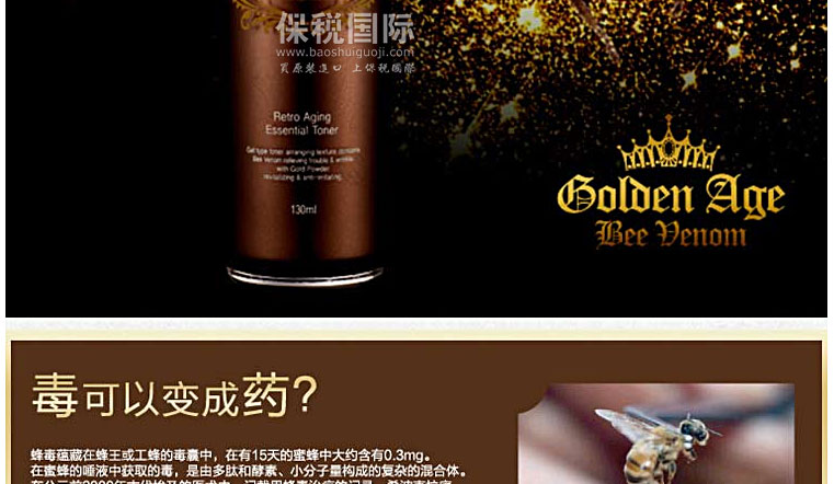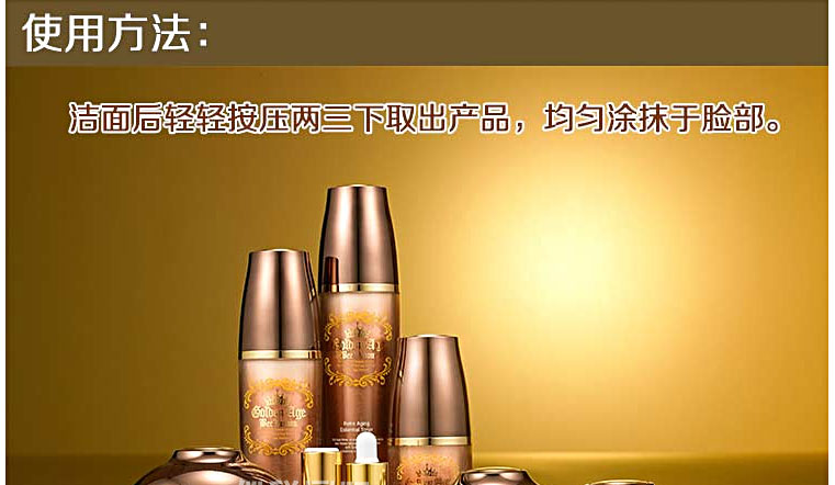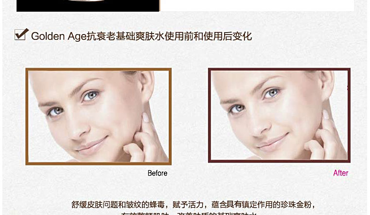 韓國Golden Age 抗衰老基礎滋潤爽膚水 130ml—— 1.牡丹根提取物、黃芩提取物、地黃提取物、艾葉提取物、板栗皮提取物、甘草提取物,有機漿果提取物; 2.有大量必備氨基酸提供營養,抗酸化作用,美白; 3.構成成分的75%縮氨酸,提高人體免疫力,防止異物和炎癥; 4. 24K:防止老化,抗皺,解毒/輔酶Q10:防止氧化,護膚,美白效果; 5. 5種韓方結合。 注:敏感肌膚慎用,可隱蔽處進行皮膚測試后使用。 |