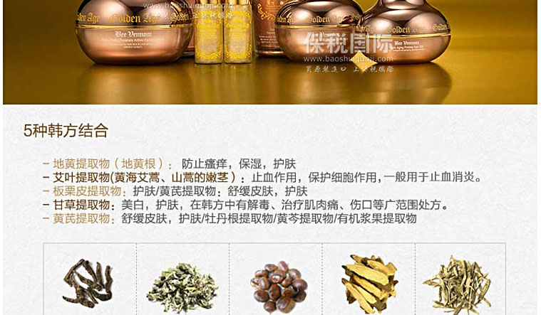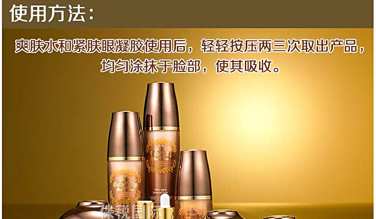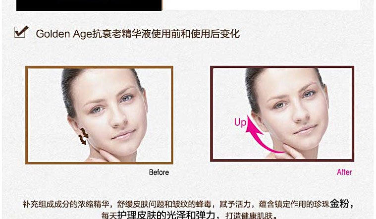 韓國Golden Age 抗衰老深層補(bǔ)水精華液 50ml—— 1.牡丹根提取物、黃芩提取物、地黃提取物、艾葉提取物、板栗皮提取物、甘草提取物,有機(jī)漿果提取物; 2.有大量必備氨基酸提供營養(yǎng),抗酸化作用,美白; 3.構(gòu)成成分的75%縮氨酸,提高人體免疫力,防止異物和炎癥; 4. 24K:防止老化,抗皺,解毒/輔酶Q10:防止氧化,護(hù)膚,美白效果; 5. 5種韓方結(jié)合。 |