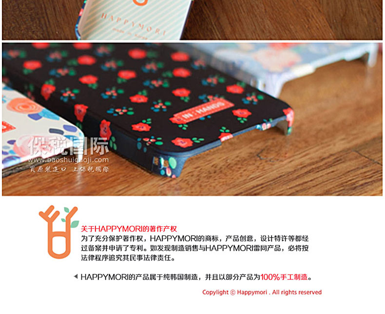韓國Happymori藍底牡丹圖案手機殼—— 1.PC材質,耐熱,耐沖擊,抗摔,且不易變形 2.設計簡約,大方,凸顯女孩的氣質 3.含苞待放的花朵,紫色和各種彩色互相輝映,更顯女性魅力! 備注:硬質材料在大的沖擊下容易破損,使用時請格外注意! |