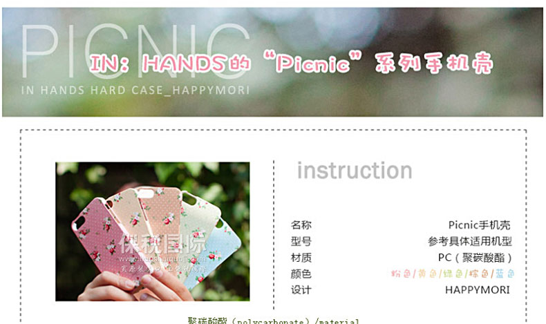 韓國Happymori“花園”之Picnic系列黃色手機殼—— 1.PC材質,耐熱,耐沖擊,抗摔,且不易變形 2.設計簡約,大方,充滿朝氣! 3.隱隱的圓點花紋配上小碎花,帶您一起感受“Picnic”的活潑燦爛。 備注:硬質材料在大的沖擊下容易破損,使用時請格外注意! |