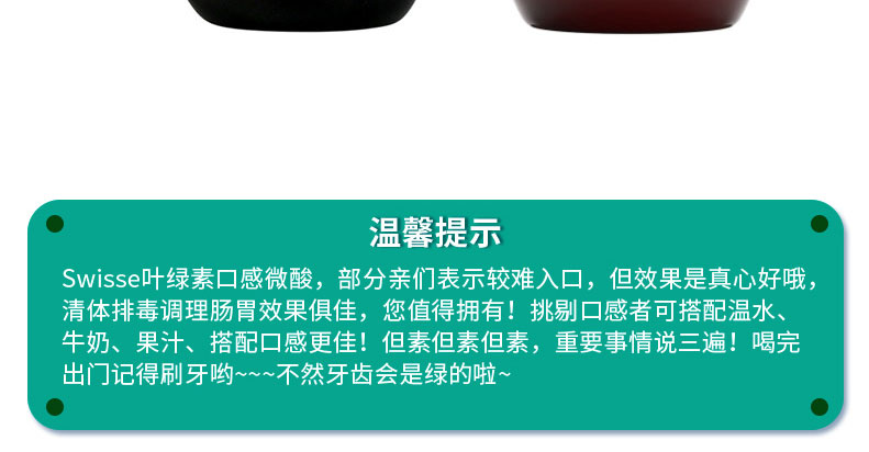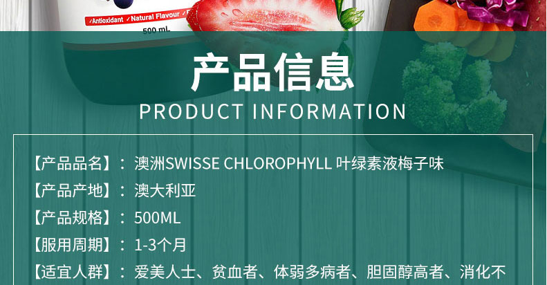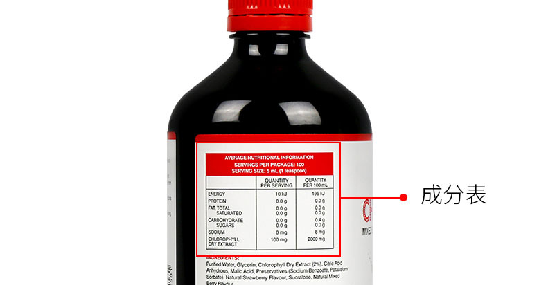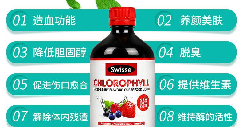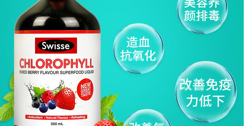 澳大利亞原裝進口Swisse Chlorophyll Mixed Berry葉綠素口服液 梅子味500ml —— 葉綠素長期飲用能抑制細菌的繁殖、改善口腔衛生、提升心臟運作效率、消除體味、消除女性月事痛經、增加紅血球、加強細胞操作功能、減輕風濕關節痛楚、改善痛風、改善貧血,增強內分泌系統功能,改善喉嚨痛、改善哮喘問題、促進血液循環、延緩衰老、促進消化功能、良好的清血劑、供應大量鐵質、抗毒、防癌、治消化性潰瘍,加速傷口無疤痊合、可敷搽皮膚外傷殺菌消炎、促進肺臟功能、通暢支氣管、促進甲狀腺機能、提升免疫系統、清熱解毒、改善失眠問題,改善肝臟功能、平衡人體的酸堿水平,抑制自由基,促進新陳代謝、提高人體的抗氧化作用,消除體臭及口臭 改善暗瘡,色斑,便秘. 怕冷.延緩衰老.殺菌消炎.解酒.. |