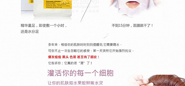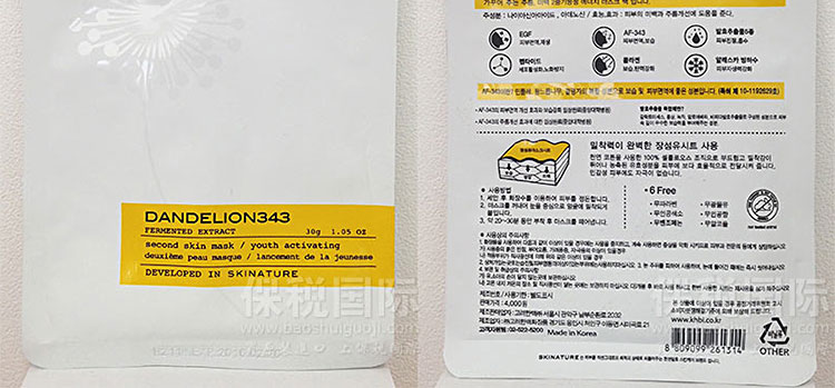 韓國 SKINATURE 蒲公英Second skin面膜 30g×10貼 —— 1. 除皺、美白雙重功效面膜含有專利成分AF-343。 2. 精細且卓越的保濕成分再加上阿拉斯加冰下水的豐富礦物質,能增強皮膚的防御力及自生力,持續供給營養和水分,使皮膚重現生命力。 3. 發酵復合提取成分所含有的再生作用可以使粗糙的皮膚年輕健康。 |