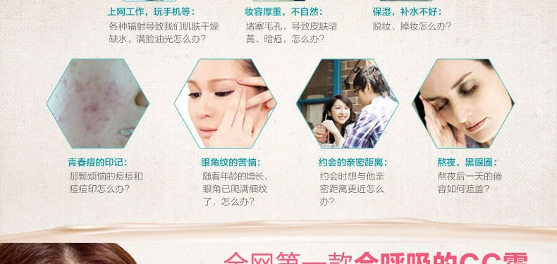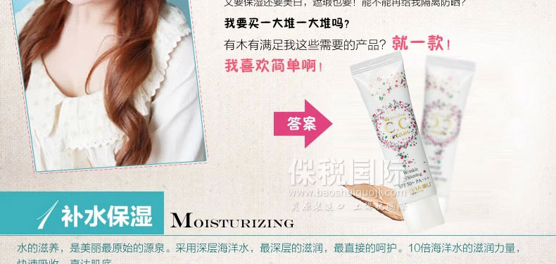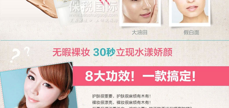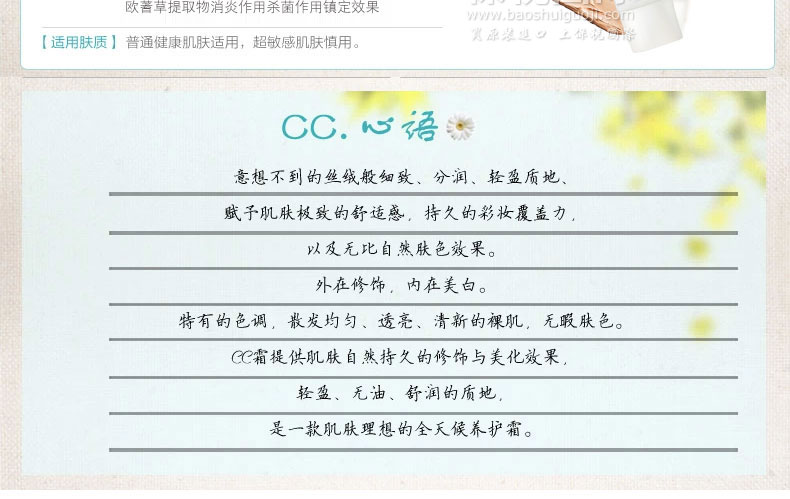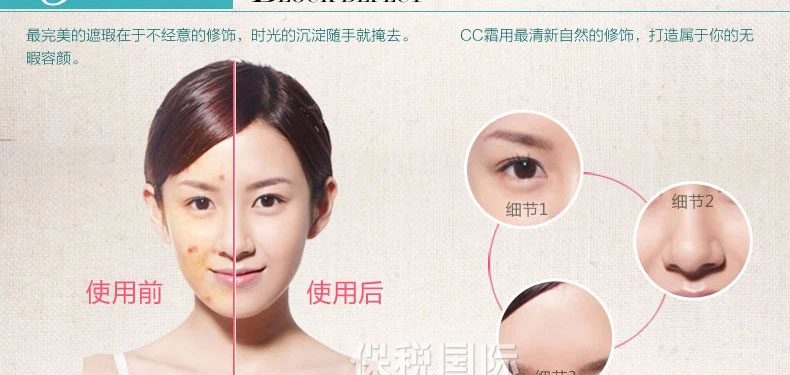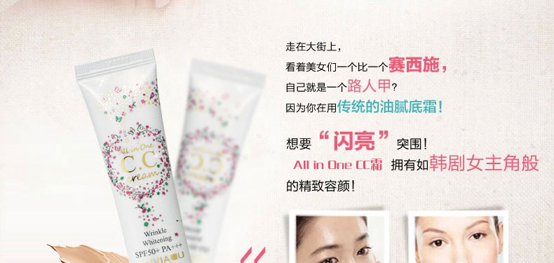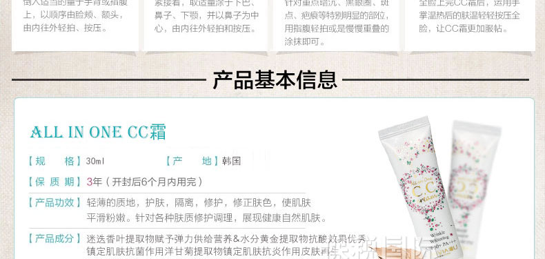 韓國原裝進(jìn)口普瑞雅美白超遮瑕裸妝CC霜SPF 50+ PA+++ 30g —— 可以調(diào)節(jié)出自然白皙膚色,完美遮瑕細(xì)紋,毛孔粗大,斑點(diǎn),痘印等,擺脫暗沉肌膚狀態(tài),自然白皙,輕易打造時尚妝容。 |