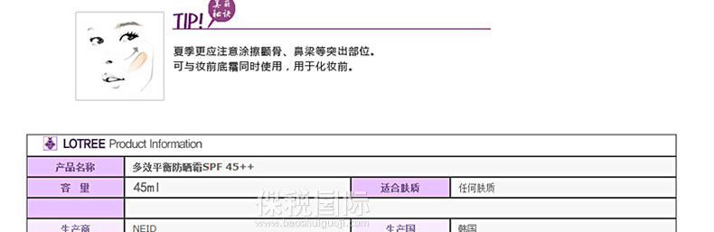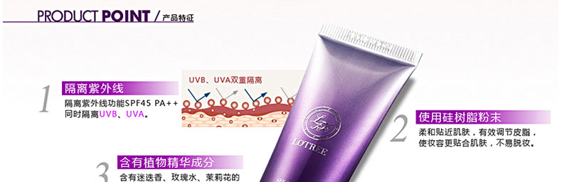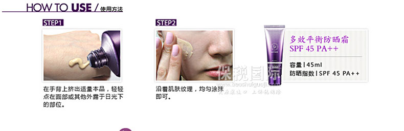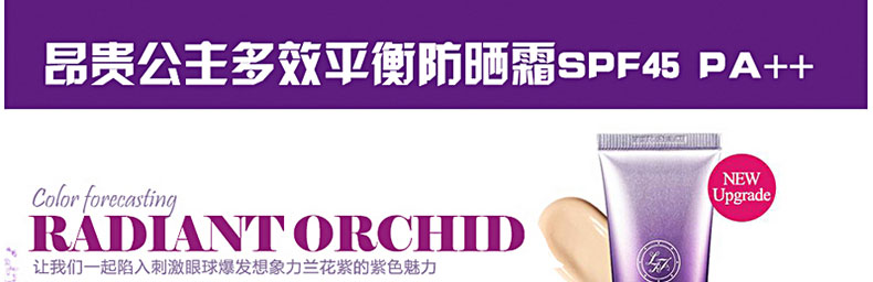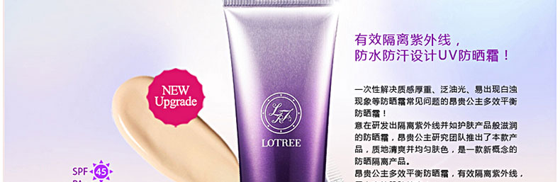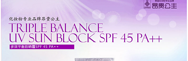 韓國原裝進口昂貴公主多效平衡防曬霜SPF45 PA++—— 隔離紫外線功能SPF 45 PA++同時隔離UVB、UVA。使用硅樹脂粉末柔和貼近肌膚,有效調節皮脂,使妝容更貼合肌膚,不易脫妝.含有植物精華成分含有迷迭香、玫瑰水、茉莉花的植物精華成分,用后肌膚水感滋潤,更易卸妝,保護肌膚。肌膚光彩照人提亮膚色,綻放亮澤光彩,淺米色內容物,用后膚色更加自然。 |