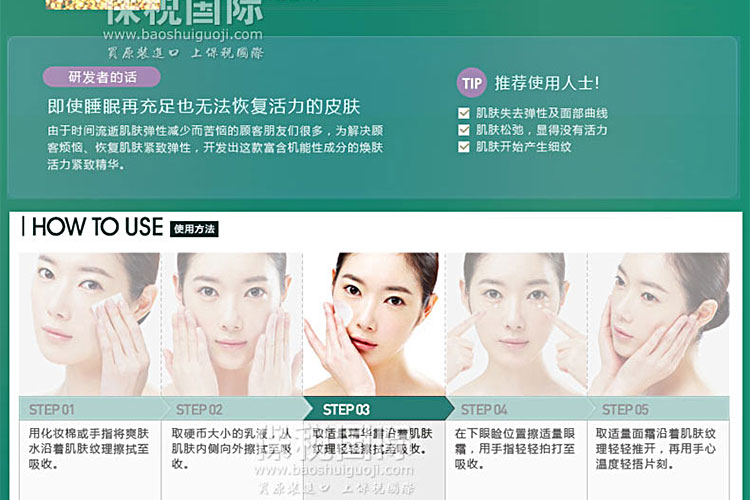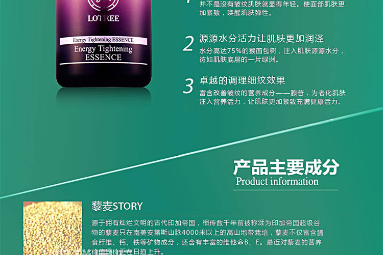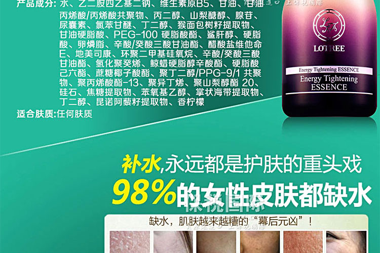韓國原裝進口LOTREE昂貴公主煥膚活力緊致精華—— 緊致肌膚,煥發年輕光彩并不是沒有皺紋肌膚就是顯得年輕。使面部肌膚更加緊致,喚醒肌膚彈性。源源水分活力讓肌膚更加潤澤。水分高達75%的猴面包樹,注入肌膚源源水分,仿如肌膚底層的一片綠洲。卓越的調理細紋效果。富含改善皺紋的營養成分---腺苷,為老化肌膚注入營養活力,讓肌膚更加緊致蟲棉健康活力。 |