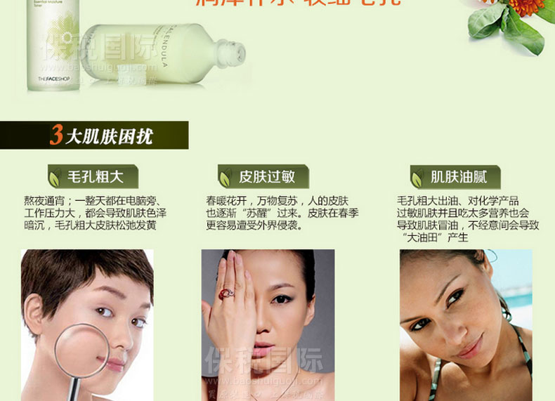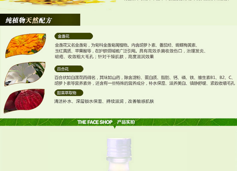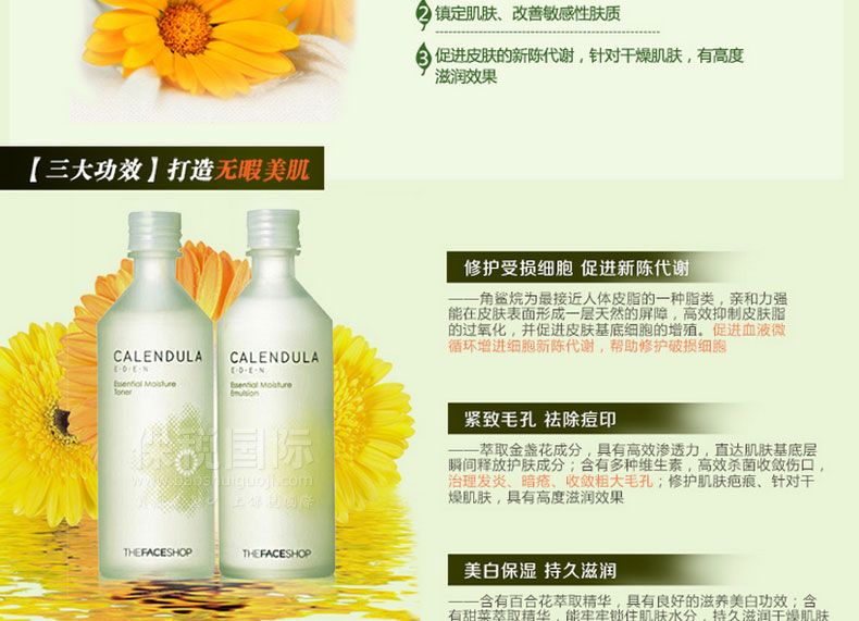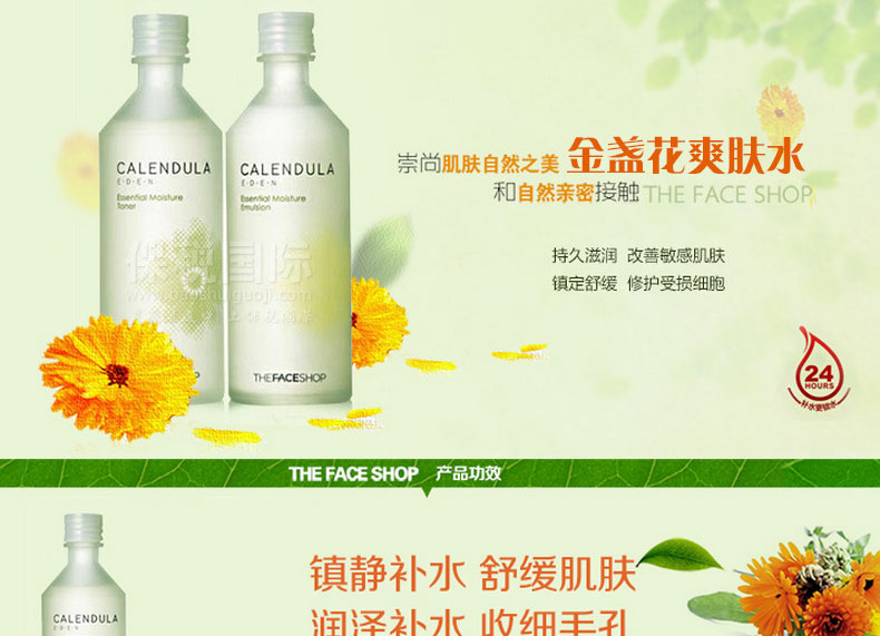 韓國 the Face Shop/菲詩小鋪 金盞花保濕爽膚水—— 含有金盞花成分,具有抗敏,舒暖,鎮(zhèn)定功效 獨特分子結構具有高效強滲透力 含有仙人掌花提取物,含豐富保濕成分,長時間維持滋潤肌膚 輕柔不黏膩的緊貼力,賦予肌膚光澤 在肌膚表面形成柔滑滋潤的保護膜