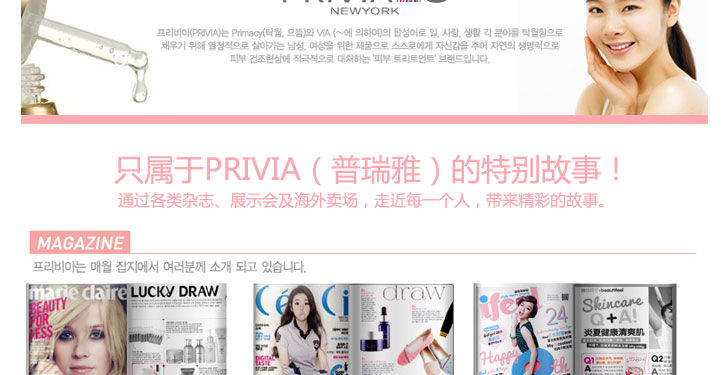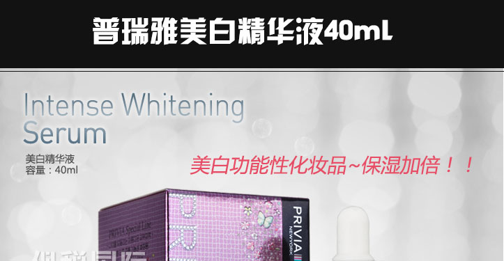 韓國原裝進口普瑞雅美白精華液 40ml—— 有效提亮暗淡無光的膚色,令肌膚嫩白,透明。 鎖水因子,有效鎖住肌膚水分,持久保持肌膚滋潤。 |