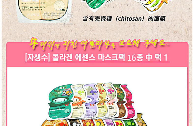 韓國Arang 自生秀緊致舒緩膠原蛋白系列面膜 10片裝—— 提取純凈深海魚類的海洋膠原蛋白,富含肌膚不可或缺的滋潤元素,搭配高科技水解彈力蛋白,使肌膚豐盈飽滿富有彈性!16款隨意搭配,效果更佳! 使用方法:潔面后先使用爽膚水整頓肌膚,然后取出面膜貼貼于面部,過15-20分鐘后將面膜貼揭下,用手輕拍殘留在臉上的精華液,使精華液全部吸收。 |