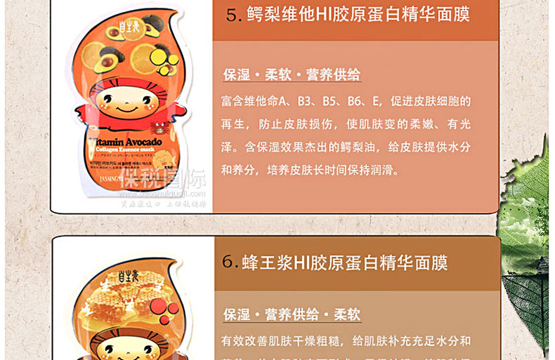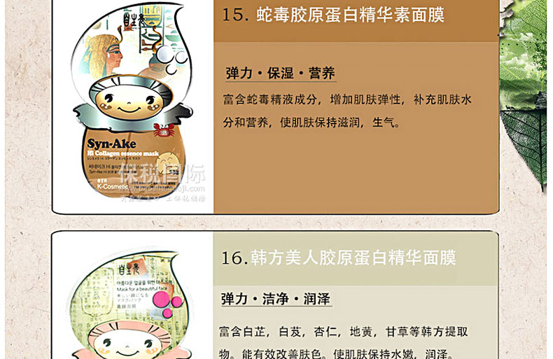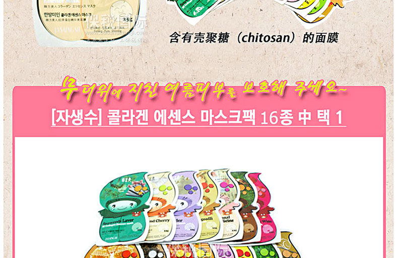 韓國Arang 自生秀緊致舒緩膠原蛋白系列面膜 10片裝—— 提取純凈深海魚類的海洋膠原蛋白,富含肌膚不可或缺的滋潤元素,搭配高科技水解彈力蛋白,使肌膚豐盈飽滿富有彈性!16款隨意搭配,效果更佳! 使用方法:潔面后先使用爽膚水整頓肌膚,然后取出面膜貼貼于面部,過15-20分鐘后將面膜貼揭下,用手輕拍殘留在臉上的精華液,使精華液全部吸收。 |
