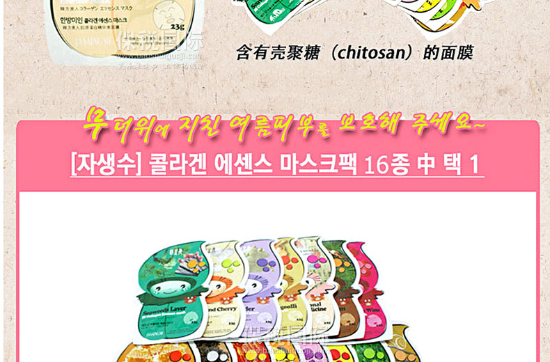 韓國Arang 自生秀緊致舒緩膠原蛋白系列面膜 10片裝—— 提取純凈深海魚類的海洋膠原蛋白,富含肌膚不可或缺的滋潤元素,搭配高科技水解彈力蛋白,使肌膚豐盈飽滿富有彈性!16款隨意搭配,效果更佳! 使用方法:潔面后先使用爽膚水整頓肌膚,然后取出面膜貼貼于面部,過15-20分鐘后將面膜貼揭下,用手輕拍殘留在臉上的精華液,使精華液全部吸收。 |