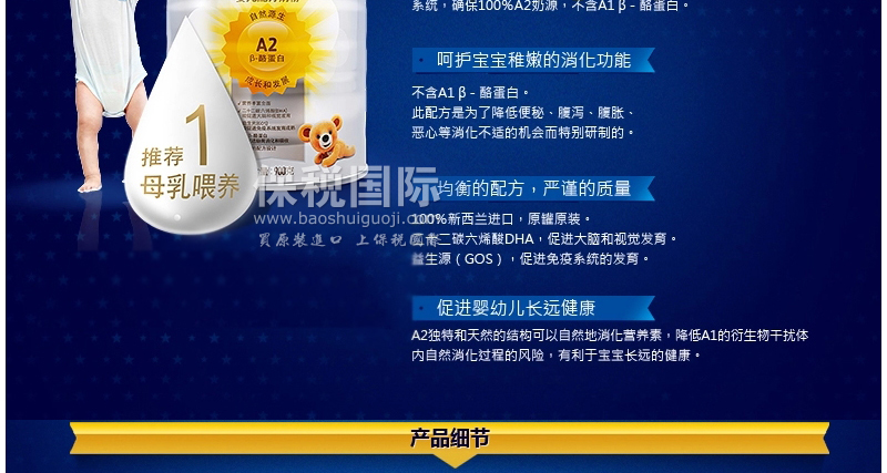 新西蘭 a2 原罐原裝進口高端嬰幼兒配方牛奶粉 1段 900g*6罐—— 1.a2奶粉是全球唯一僅含有A2 β-酪蛋白奶粉(與母乳同為A2型酪蛋白),非常珍惜獨特的奶源【全球只有30%的奶牛是a2奶牛】。 2.幫助寶寶消化系統發育,而且清淡不上火哦. 3.a2奶粉和它生產的牛奶在澳洲和新西蘭都是針對高端貴族,很多澳洲家庭都會選擇a2的全脂和脫脂牛奶作為他們日常中的奶制品。澳洲家庭醫生和社區護士也會推薦母乳寶寶在斷奶后飲用a2品牌的鮮奶。 |