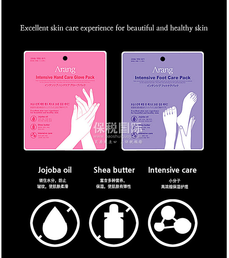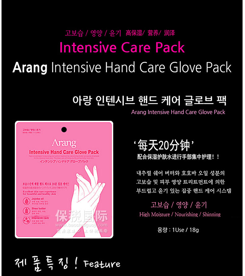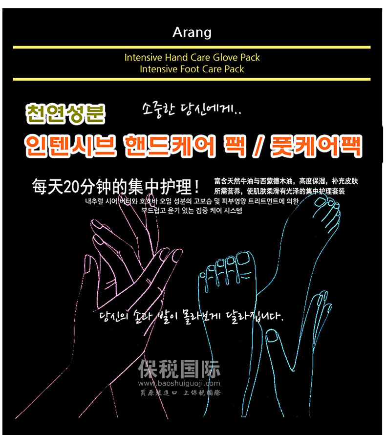 韓國Arang 超保濕集中營養(yǎng)護理手膜 10片裝—— 1.本品富含牛油與西蒙德木油的高保濕與肌膚營養(yǎng)成分能使粗糙多皺紋的雙手變得水潤柔滑。 2.從而讓您的肌膚清爽水潤。還具有抗菌消炎作用,鎮(zhèn)定肌膚,促進細胞再生,效改善肌膚問題,提升肌膚保濕能力,讓您擁有一雙水潤的雙手。 使用方法: 1.用溫水將手洗干凈后戴上Hand Care 護理手套。 2.等待約20分鐘后即可脫掉,將殘留精華液均勻涂滿整個手部。 |