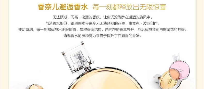 想要擁有讓他揮之不去,窒息著迷的美?想要讓他對你的味道記憶深刻、念念不忘?專為年輕女性設計的香水——香奈兒Chanel邂逅淡香水噴霧,將你難以言喻的女性魅力淋漓綻放,并在空氣中持久留香,它不斷更迭的香味,讓你的甜美氣質充滿無限驚喜!