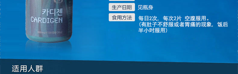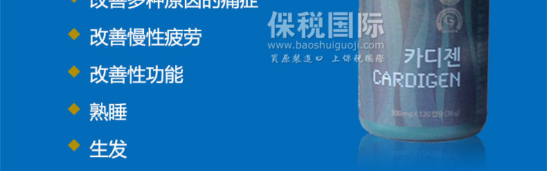 韓國原裝進口 SEANOL CARDIGEN 保健食品 120?!?/span> 1、改善血液循環 2、改善膽固醇 3、改善腦功能(注意力/記憶力) 4、改善多種原因的通癥 5、改善慢性疲勞 6、改善性功能 7、熟睡 8、生發 |