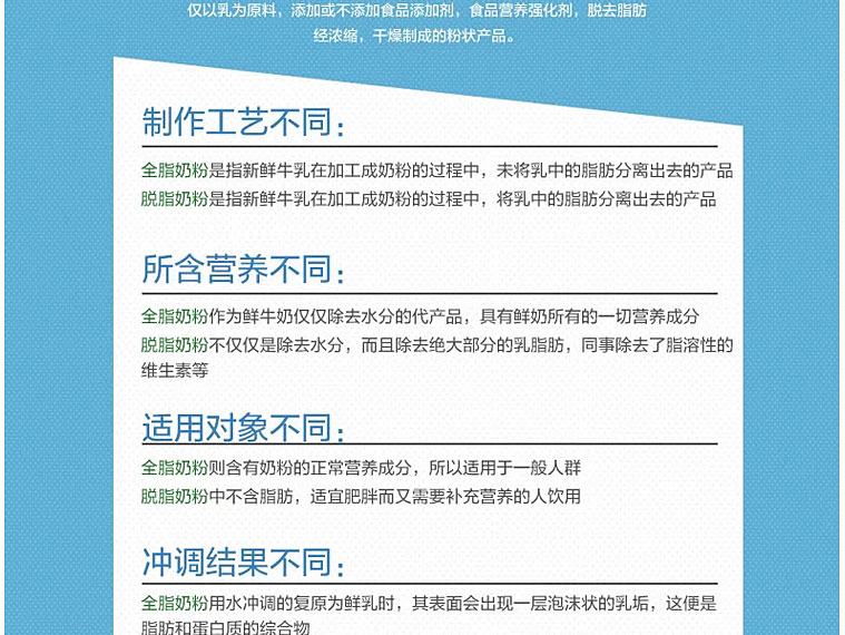 coles脫脂成人奶粉 —— 1.始終將奶粉沖入水中,而不是將水兌入奶粉中 2.5歲以上兒童至成年人都可飲用(尤其是需要補(bǔ)充營(yíng)養(yǎng)的人) 3.全脂奶粉中的礦物質(zhì)少,但由于脂肪多,熱量比脫脂奶粉高 |