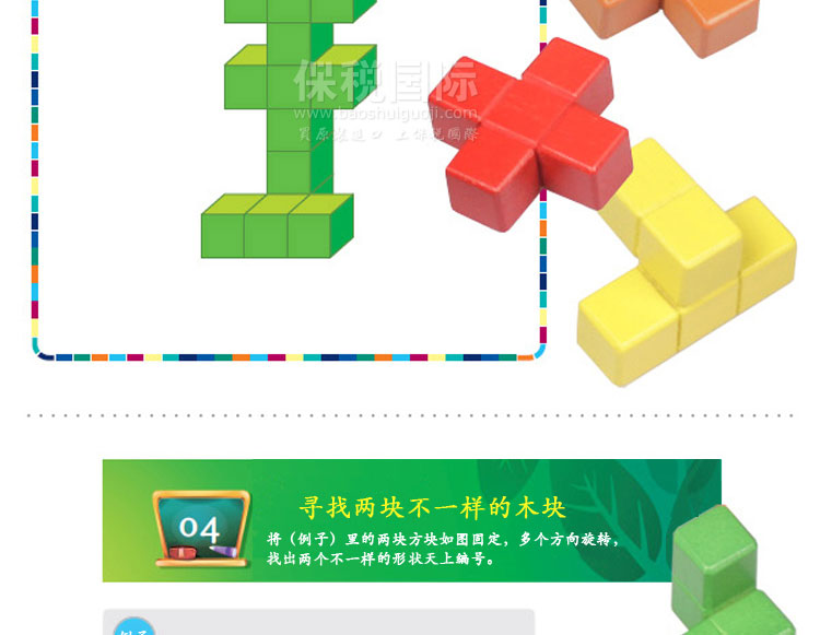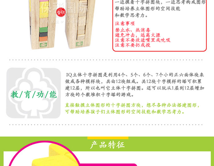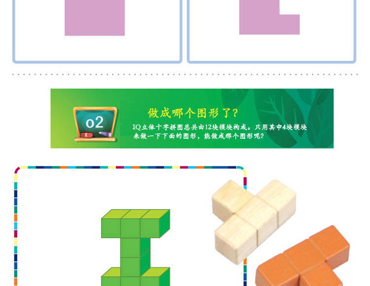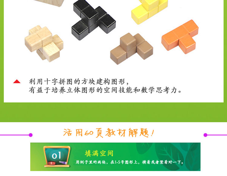 韓國(guó) WOOD PEER IQ十字拼圖 兒童早教益智玩具—— 1.IQ立體十字拼圖是利用4個(gè)、5個(gè)、6個(gè)、7個(gè)小的正六面體塊來(lái)做成各種模樣塊,共由12塊組成。 2.共12塊十字模樣的塔可積累建12層,所以也叫它立體十字拼圖。還可以玩從1層到12層增加方塊的個(gè)數(shù)堆積十字塔的游戲。 3.直接觸摸立體圖形的十字拼圖方塊,想盡各種辦法搭建圖形,可幫助培養(yǎng)孩子們立體圖形的空間技能和數(shù)學(xué)思考力。 4.利用十字拼圖的方塊建構(gòu)圖形,有益于培養(yǎng)立體圖形的空間技能和數(shù)學(xué)思考力。 |