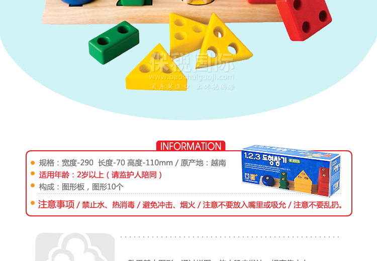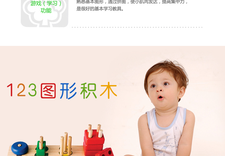 韓國 WOOD PEER 123圖形積木 兒童早教益智玩具—— 1. 熟悉基本圖形,通過拼圖,使小肌肉發達,有助于提高集中力。 2. 是有助于提高分辨圖形和顏色的能力,基本數字學習的玩具。 3. 按照木頭上印刷的數字,一邊壘圖,一邊學習數字。 |