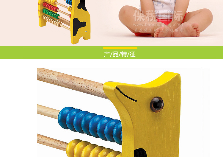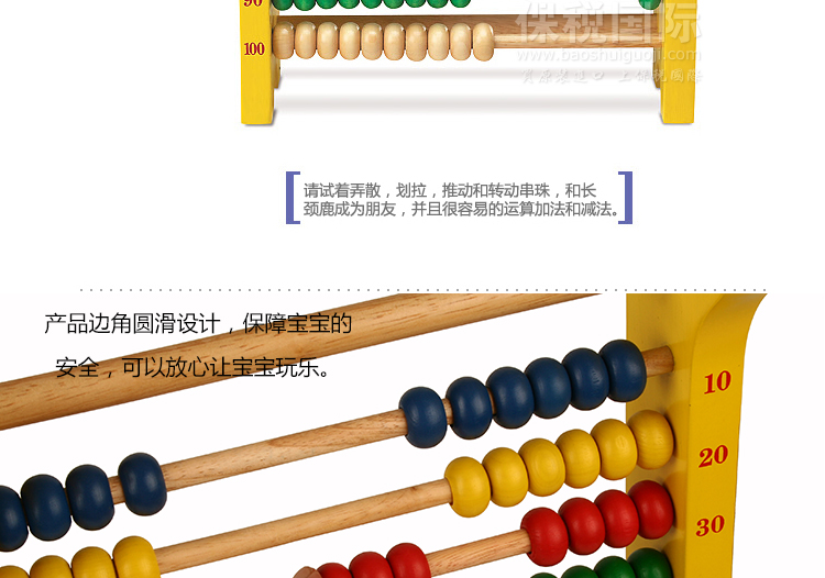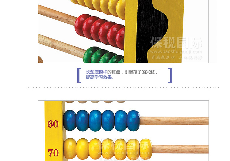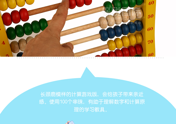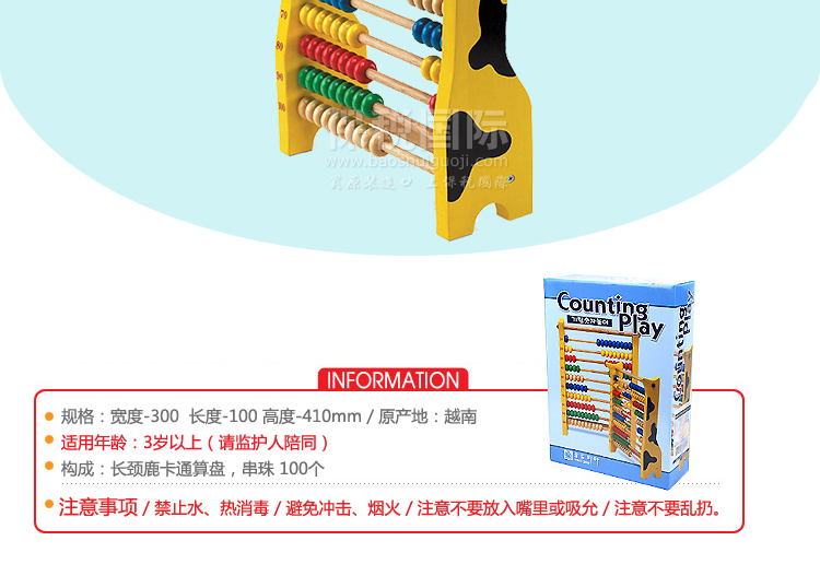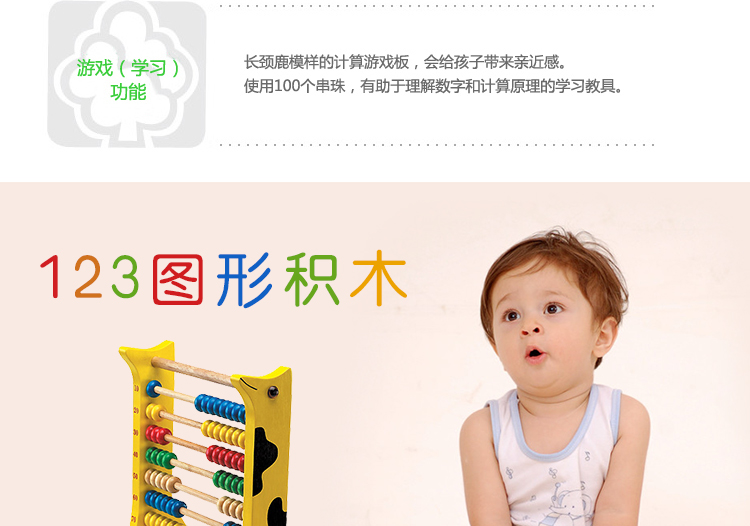 韓國 WOOD PEER 長頸鹿數字游戲 兒童早教益智玩具—— 1. 長頸鹿模樣的算盤,引起孩子的興趣,提高學習效果。 2. 直接用眼睛確認100個串珠并學習,是練習數字和相關的學習很簡單的教具。 3. 請試著弄散,劃拉,推動和轉動串珠,和長頸鹿成為朋友,并且很容易的運算加法和減法 |