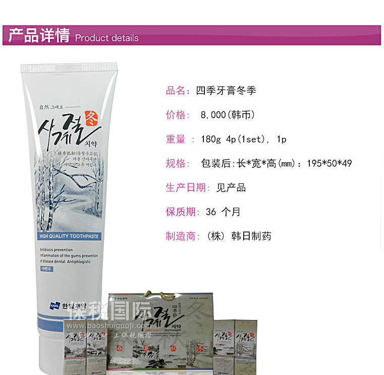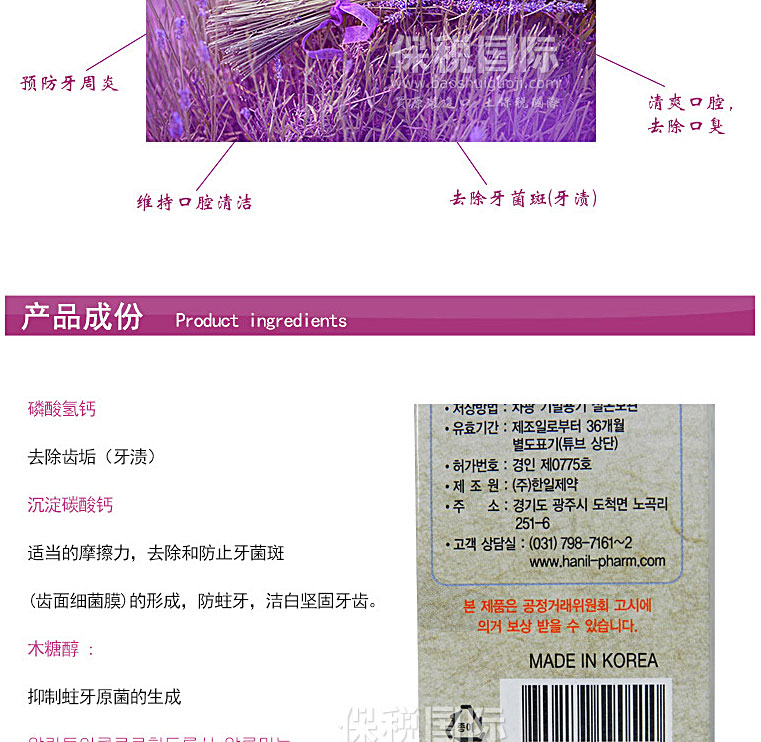 商品名稱 | 韓國韓日制藥HANIL四季草本精華冬季薰衣草香美白牙膏 180g | ||