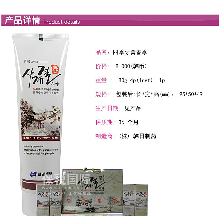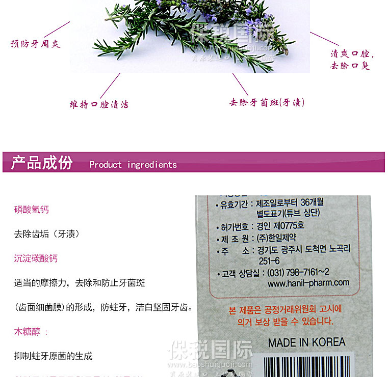 商品名稱 | 韓國韓日制藥HANIL四季草本精華春季迷迭香美白牙膏 180g | ||